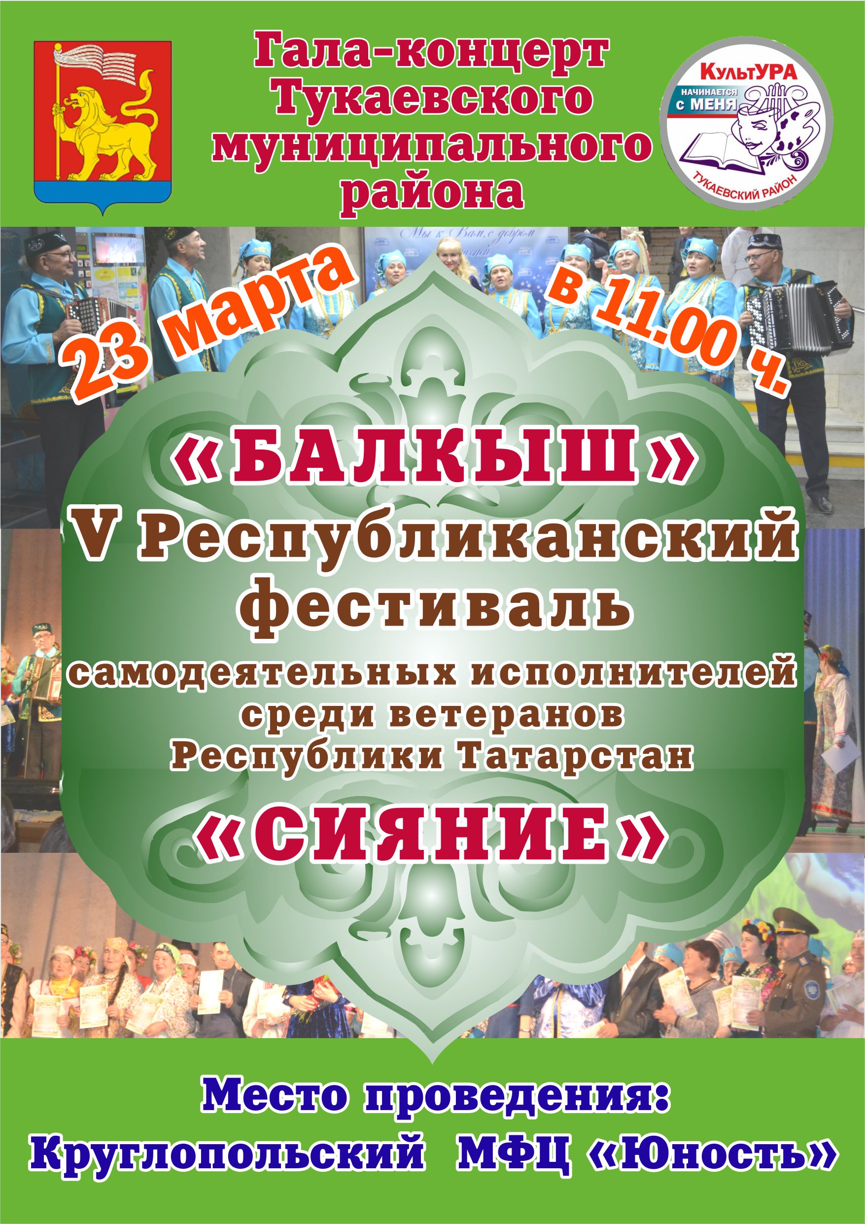 23 марта 2018 года в 11.00, в Круглопольском МФЦ « Юность», состоится Гала – концерт районного этапа, V Республиканского фестиваля самодеятельных исполнителей среди ветеранов РТ "Балкыш" (« Сияние») 2018". В,котором примут участие более 260 человек из 23 сельских поселений. Фестиваль проводится один раз в два года. В этом году он посвящен 100-летию комсомола и 73-тий годовщине Победы в Великой Отечественной Войне. Творческие коллективы продемонстрируют свои таланты в различных жанрах: в вокале, хореографии, в художественном слове. Компетентное жюри выбирет самые яркие концертные номера, которые достойно представят Тукаевский муниципальный район на Республиканском этапе фестиваля23 марта , в п. Круглое поле, в рамках V Республиканского фестиваля состоится гала-концерт "Балкыш" Тукаевского района