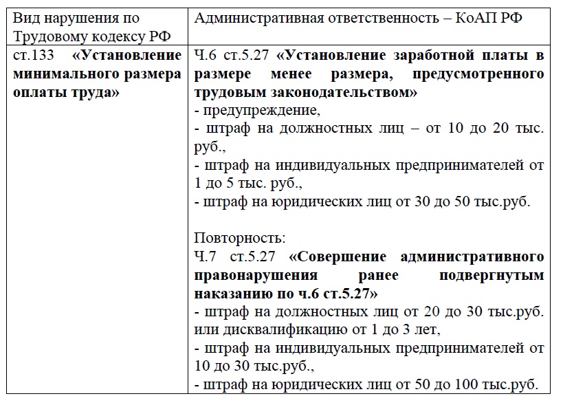 Работодатели, допустившие нарушения трудового законодательства в части обеспечения установленной государственной гарантии по выплате минимального размера оплаты труда, привлекаются к административной ответственности в соответствии со ст. 5.27 Кодекса Российской Федерации об административных правонарушениях.