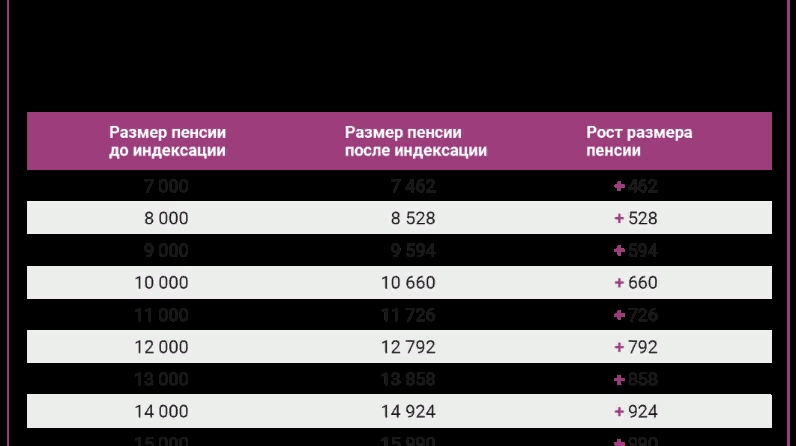 В таблице приведены суммы увеличения пенсии исходя из ее размера.