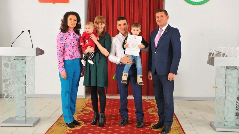 Начальник Управления ЗАГС Равиля Зарипова и начальник межрайонного Управления Пенсионного фонда Эдуард Фаттахов поздравили приглашенных родителей и вручили сертификаты 6 тукаевским семьям.