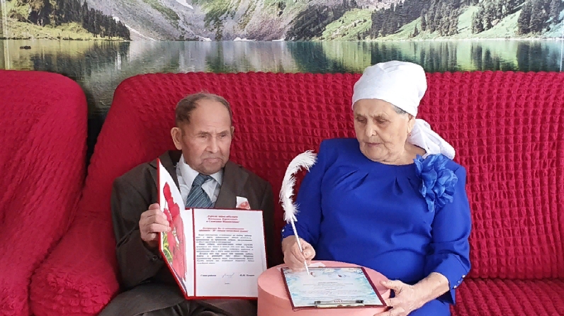 Очень забавно началась история любви этой супружеской пары. Это случилось в морозном январе, когда юная Светлана возвращалась вместе с подружками с фермы. Позади остановилась повозка, вдруг сзади ее схватил незнакомый крепкий парень, усадил на сани и увез далеко из родной деревни. С тех пор они не расставались. В любви и радости супруги вырастили 4 детей, 3 внуков, которые подарили им 2 правнуков. Отдел ЗАГС торжественно поздравил юбиляров пожелал им долгих лет счастливой жизни.