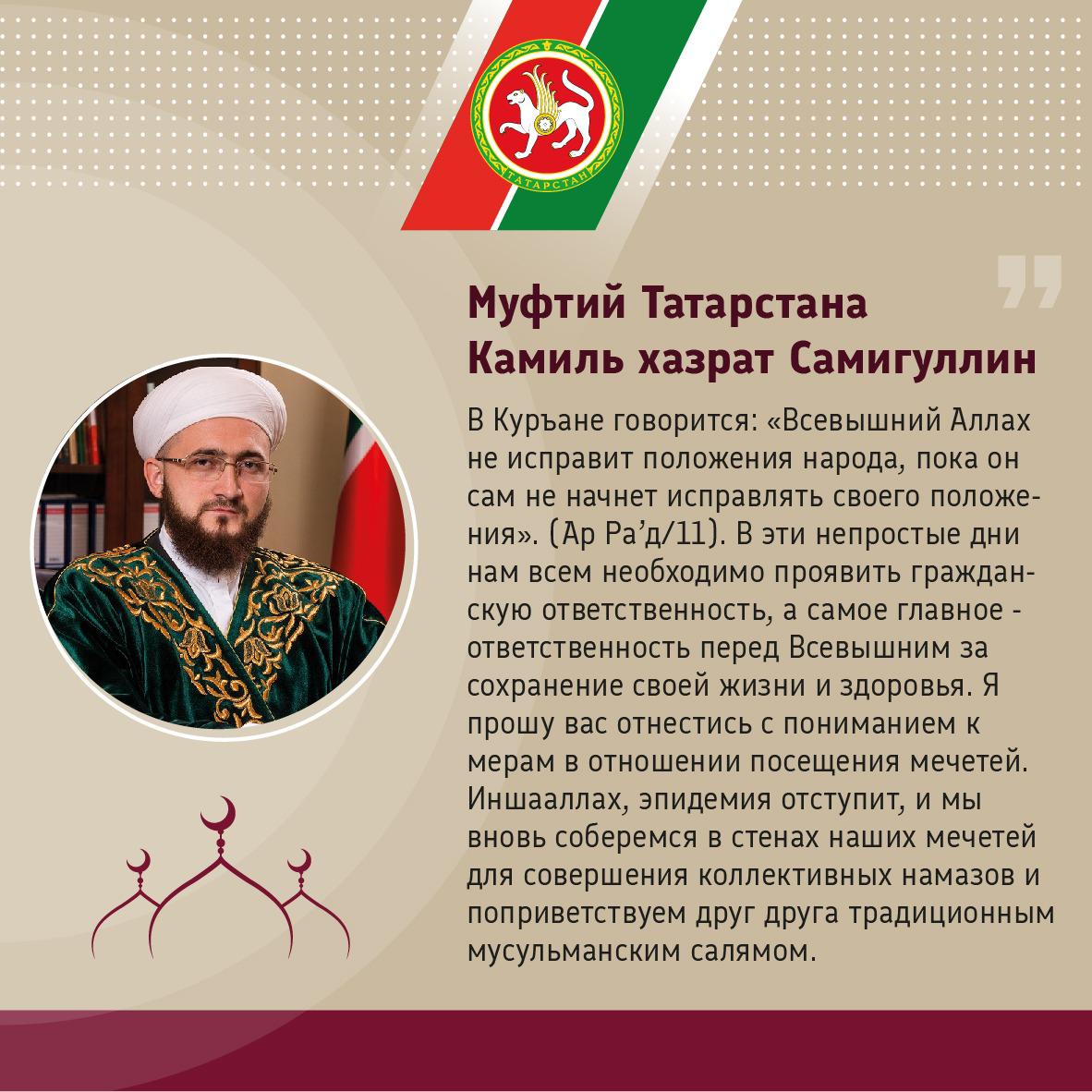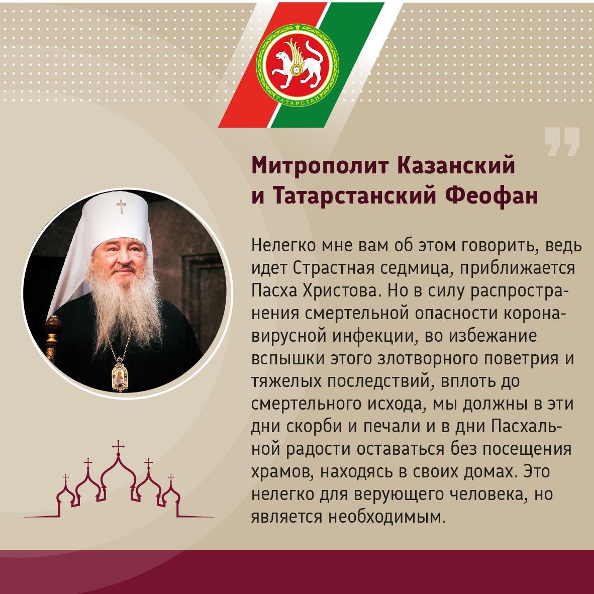 Муфтий Татарстана Камиль хазрат Самигуллин и митрополит Казанский и Татарстанский Феофан призвали верующих отнестись с пониманием к предпринимаемым мерам и проявить гражданскую ответственность, соблюдая режим самоизоляции.
