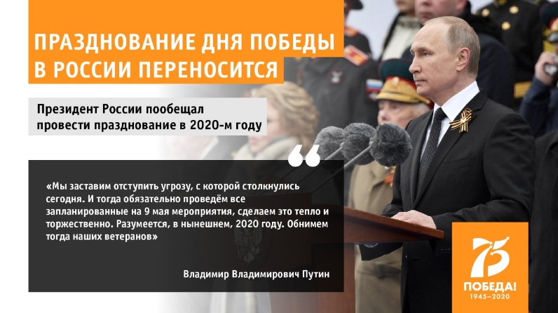 По решению Президента России все праздничные мероприятия по случаю 75-летия Победы, в том числе парад Победы и шествие Бессмертного полка, были перенесены. Точная дата их проведения пока не определена. Но торжества обязательно состоятся, когда исчезнет риск для жизни граждан, пообещал Владимир Путин.