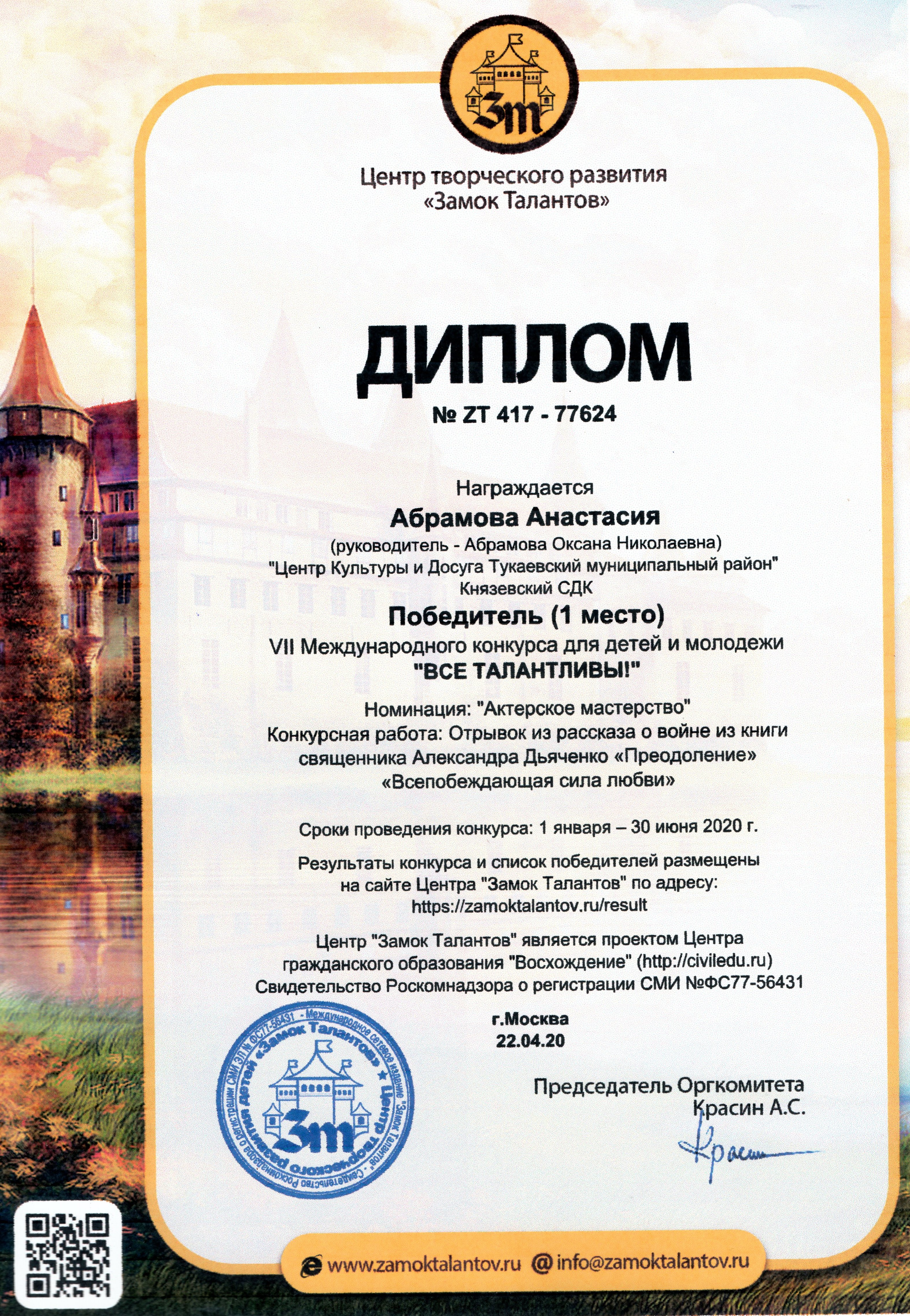 Участница театрального коллектива «Балаган» Князевского дома культуры Анастасия Абрамова (руководитель Абрамова Оксана Николаевна) принимала активное участие (заочно) в VII Международном конкурсе для детей и молодежи «Все талантливы!» в номинации «Актерское мастерство» и стала Лауреатом 1 степени.