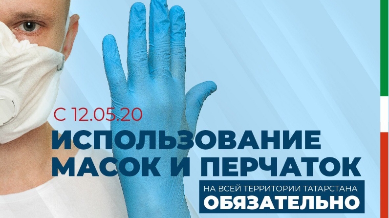 Друзья, напоминаем, что с 12 мая на всей территории в Татарстане введено обязательное использование масок и перчаток.