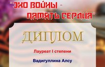 Вадигуллина Алсу ,воспитанница МБДОУ - д/с «Ак каен» Тукаевского муниципального района РТ в очередной раз удостоена диплома Лауреата I степени в Открытом Региональном онлайн-фестивале народного творчества "Эхо войны-память сердца". Благодарим Алсу и её педагога - Хайрутдинову Гульмиру Накиповну за активное участие в конкурсах и желаем дальнейших успехов!