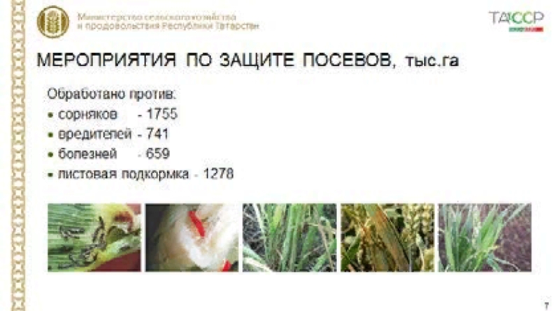 Сегодня из-за благоприятной влажной погоды на посевах наблюдается развитие болезней и вредителей. Непринятие своевременных мер будет значительно корректировать качество и количество будущего урожая. Защита посевов выполнена на 3,1 млн.га. Минсельхозпрод РТ рекомендует проводить защитные мероприятия, совмещая с листовыми подкормками. Текущий год достаточно увлажнённый, что потребует при формировании урожая применения не менее 3-х защитных обработок по вегетации. Особое внимание будем уделять защите против болезней и вредителей, совмещая их с листовыми подкормками. Высокая организованность проведения данных работ уже отмечается в Тукаевском (189 тыс.га в переводе на однократный заход одним препаратом), Мензелинском (180), Сармановском (163) и Тетюшском (161) районах.(полный текст
