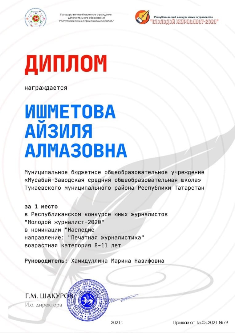 1 место в Республиканском конкурсе юных журналистов"Молодой журналист"