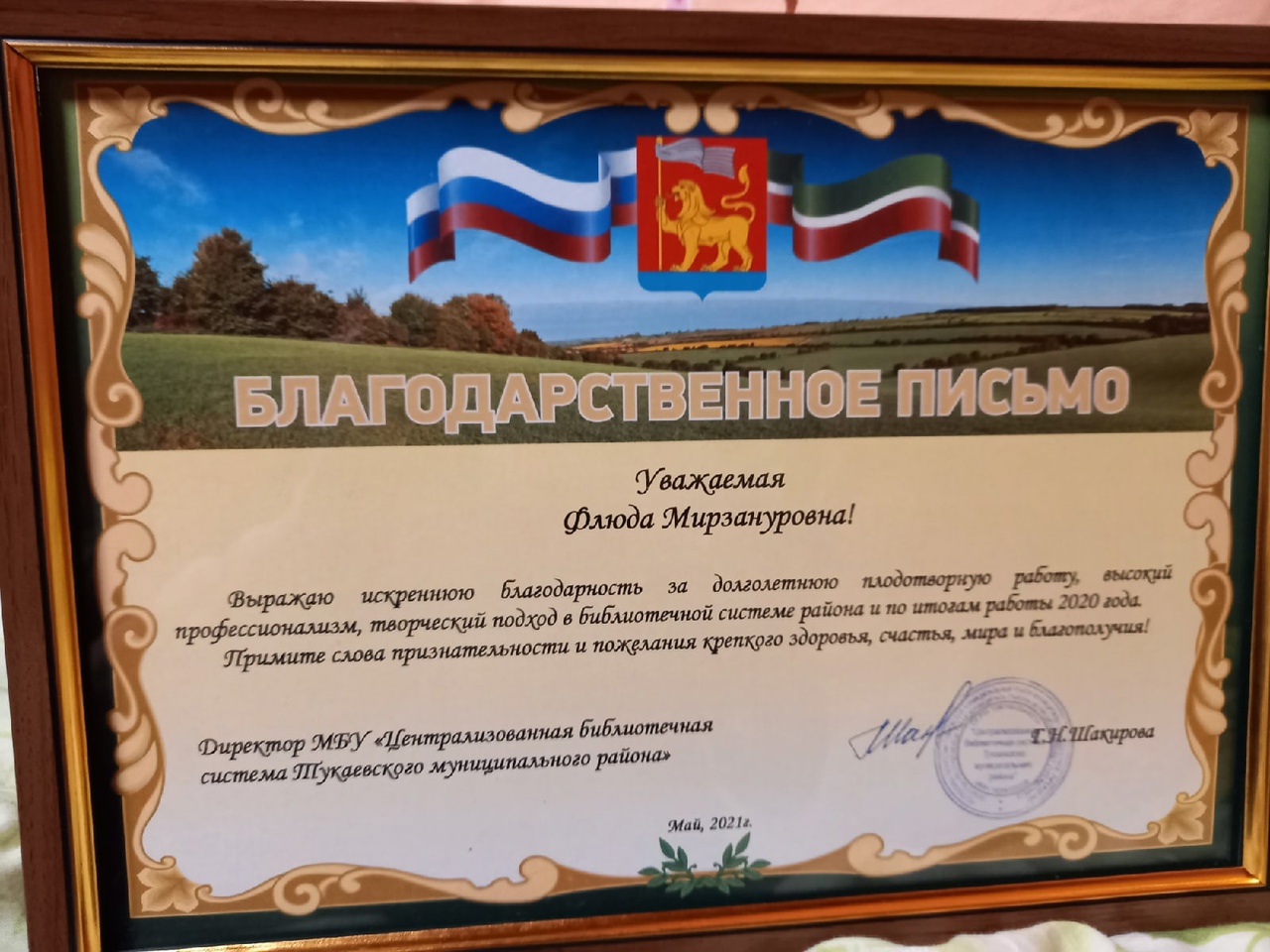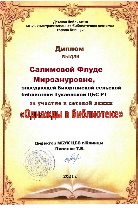 Заведующая филиалом 23 Бюрганской сельской библиотеки Централизованной библиотечной системы Тукаевского муниципального района Республики Татарстан Флуда Мирзануровна Салимова активно участвует не только в районных мероприятиях,ее успехи известны не только в масштабах Республики Татарстан,но и в других регионах.