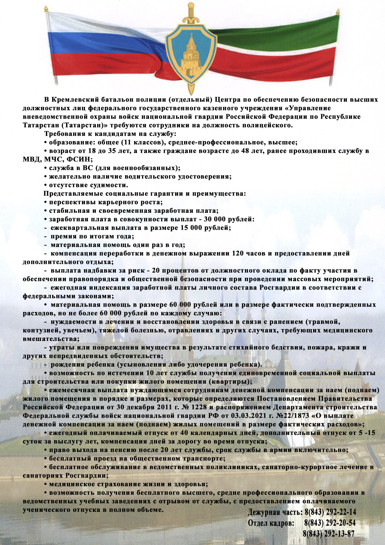За дополнительной информацией следует обращаться по телефонам: +7-903-061-25-29; 8(843) 292-22-14, 8(843) 292-21-14 (дежурная часть); 8(843) 292-20-54 (отдел кадров).