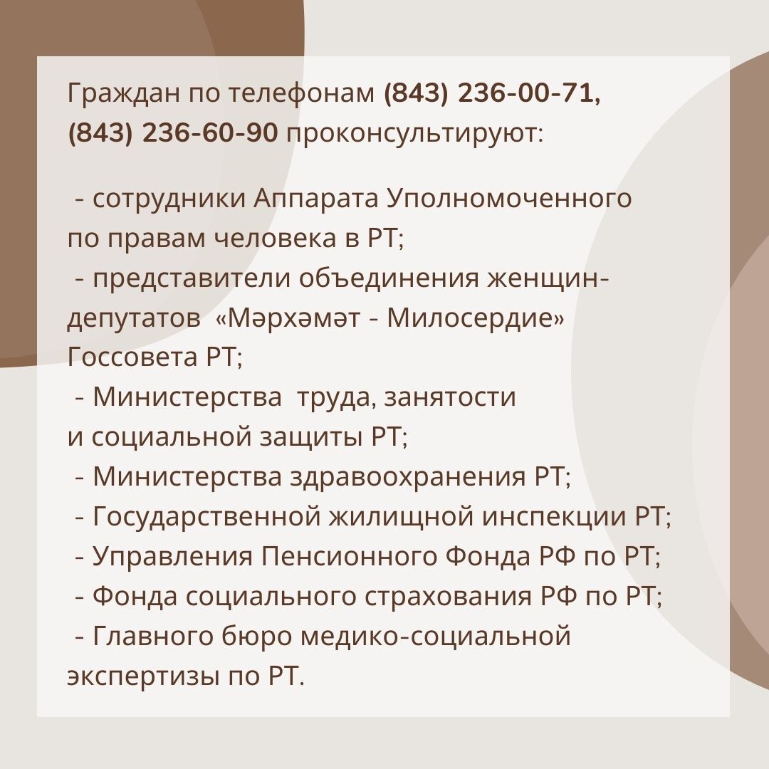 Реализуя поставленные Законом Республики Татарстан от 03.03.2000 № 95«Об Уполномоченном по правам человека в Республике Татарстан» задачи по содействию в соблюдении прав и свобод человека и гражданина, взаимодействию государственных органов Республики Татарстан в защите прав и свобод человека и гражданина Уполномоченным по правам человека в Республике Татарстан продолжается практика проведения совместных тематических телефонных«горячих линий».