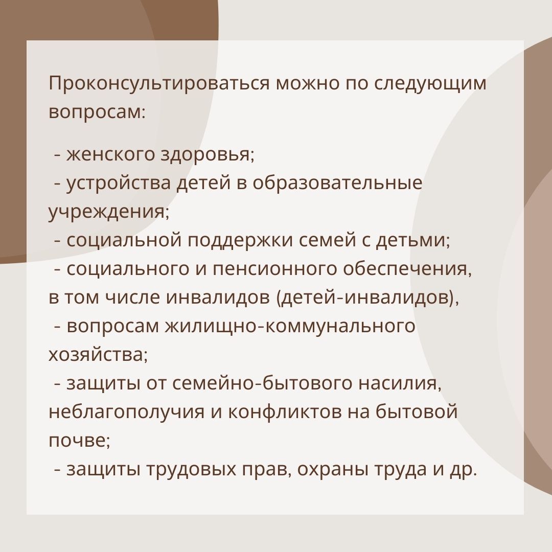 02 марта 2022 года, в преддверии международного женского дня, предлагаю провести телефонную «горячую линию» «Женский вопрос» по вопросам защиты от семейно-бытового насилия, неблагополучия и конфликтов на бытовой почве, женского здоровья, соблюдения трудовых прав, устройства детей в образовательные учреждения, социальной защиты и социального обеспечения семей с детьми, вопросам жилищно-коммунального хозяйства и др.