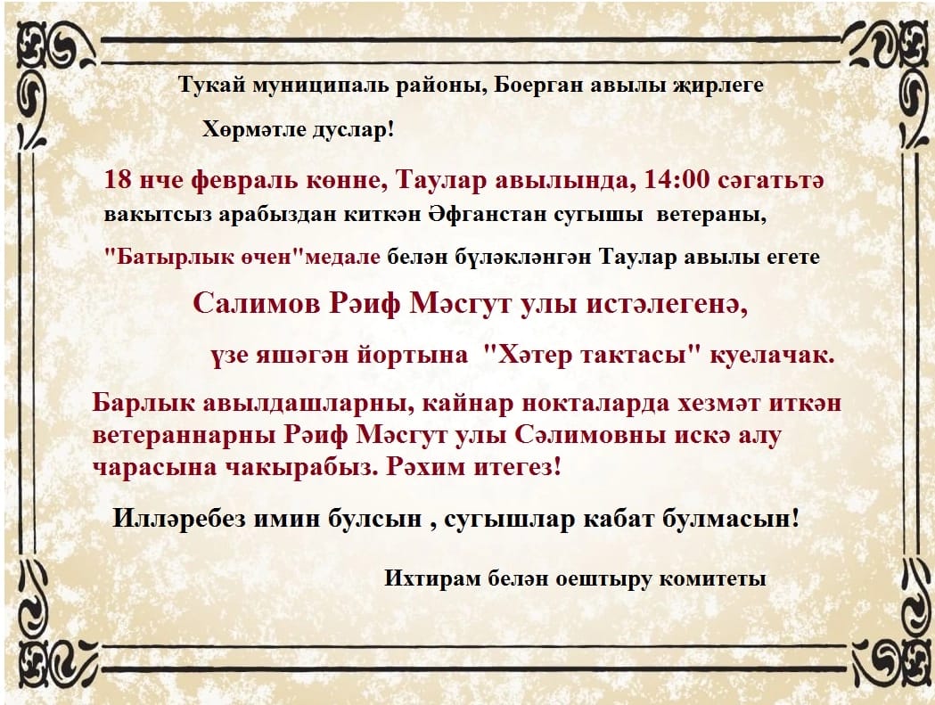 18 нче февраль көнне, Тукай районы Боерган авыл җирлегенә караган Таулар авыльнда, 14:00 сагатьтә Әфганстан сугышы ветераны , "Батырлык өчен"медале белен буләкләнгән Таулар авылы егете Сәлимов Рәиф Мәсгут улы истәлегенә ''Хәтер тактасы'' куелачак.