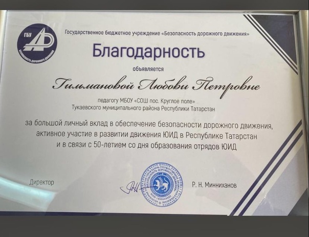 Резеда Гильмутдинова вручила «Благодарственное письмо» от имени директора ГБУ "Безопасность дорожного движения" Рифката Минниханова заместителю директора по воспитательной работе Любови Гильмановой за большой и личный вклад в обеспечении безопасности, активное участие в развитии движения ЮИД в Республики Татарстан.