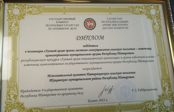 Исполнительный комитет Иштеряковского сельского поселения победил в республиканском конкурсе в номинации "Лучший архив органа местного самоуправления сельского поселения - источника комплектования муниципального архива Республики Татарстан" и награжден дипломом победителя!