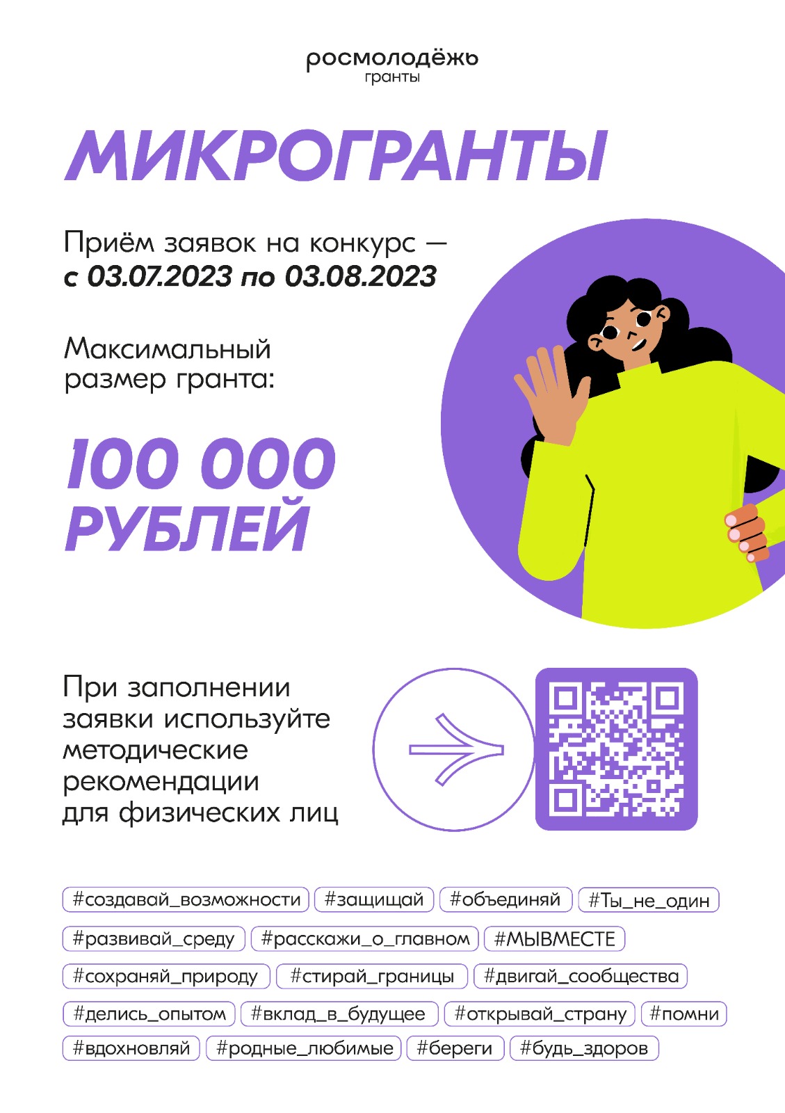 Специально для тебя мы проводим конкурс Росмолодёжь.Гранты: «Микрогранты», в котором можно выиграть сумму до 100 тысяч рублей. Ещё один приятный бонус этого конкурса – в микрогрантах упрощённая система отчётной документации!