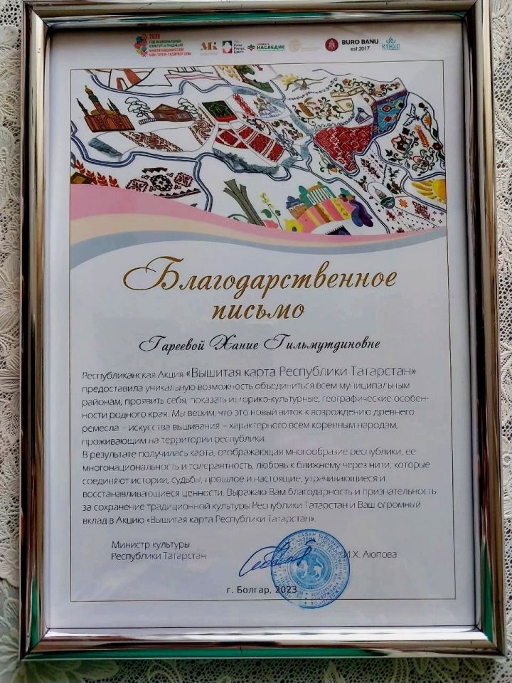 С презентации вышитой карты Татарстана, которая прошла в городе Болгар в рамках фестиваля «Возрождение: Эпос в современном прочтении» вернулась художница из села Калмия Хания Гареева.