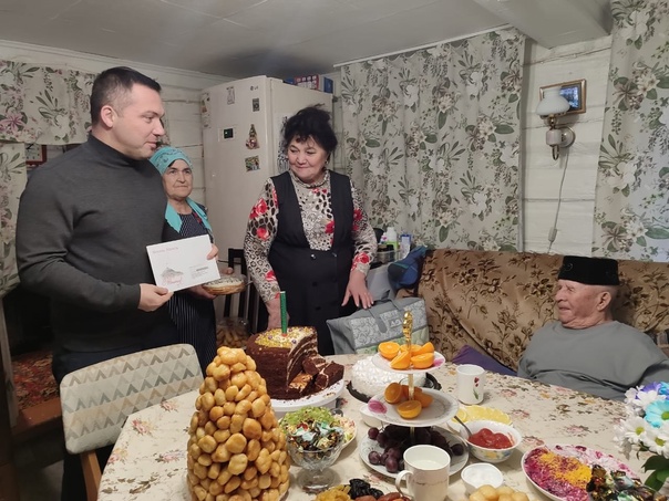 Поздравления и подарки от имени президента России Владимира Путина и Главы района Фаиля Камаева юбиляру вручили и.о. заместителя руководителя Исполнительного комитета по социальным вопросам Айзат Махмутов и председатель Совета ветеранов и инвалидов Файруза Вазеева.