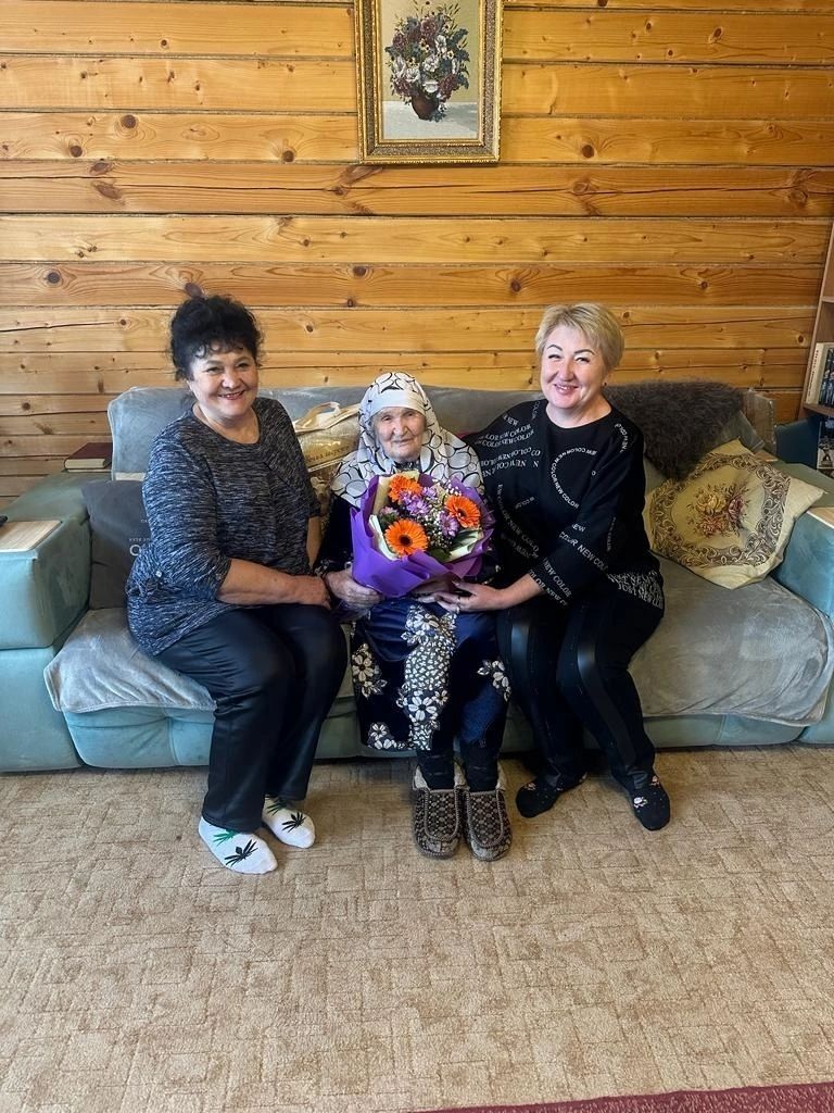 Поздравить юбиляра и вручить ей памятный подарок приехали глава Новотроицкого сельского поселения Дамира Габделхаева и председатель Совета ветеранов района Файруза Вазеева.