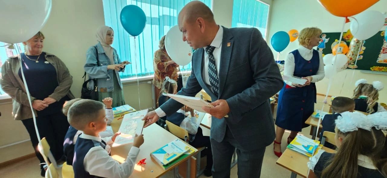 После первого звонка для школьников Айрат Хабибуллин посетил класс первоклашек, сегодня первый раз первый класс пришли 40 детей. Айрат Хабибуллин вручил книги и поздравил детей и родителей.