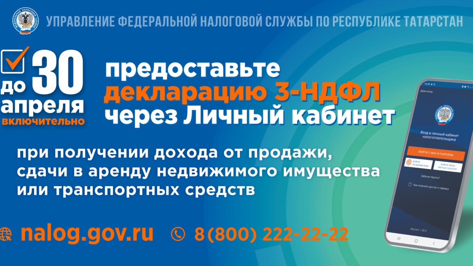 «Граждане, получившие доходы от продажи или получения в дар имущества, а также сдачи имущества в аренду обязаны до 30 апреля представить декларацию 3-НДФЛ. Подробнее на сайте nalog.gov.ru».