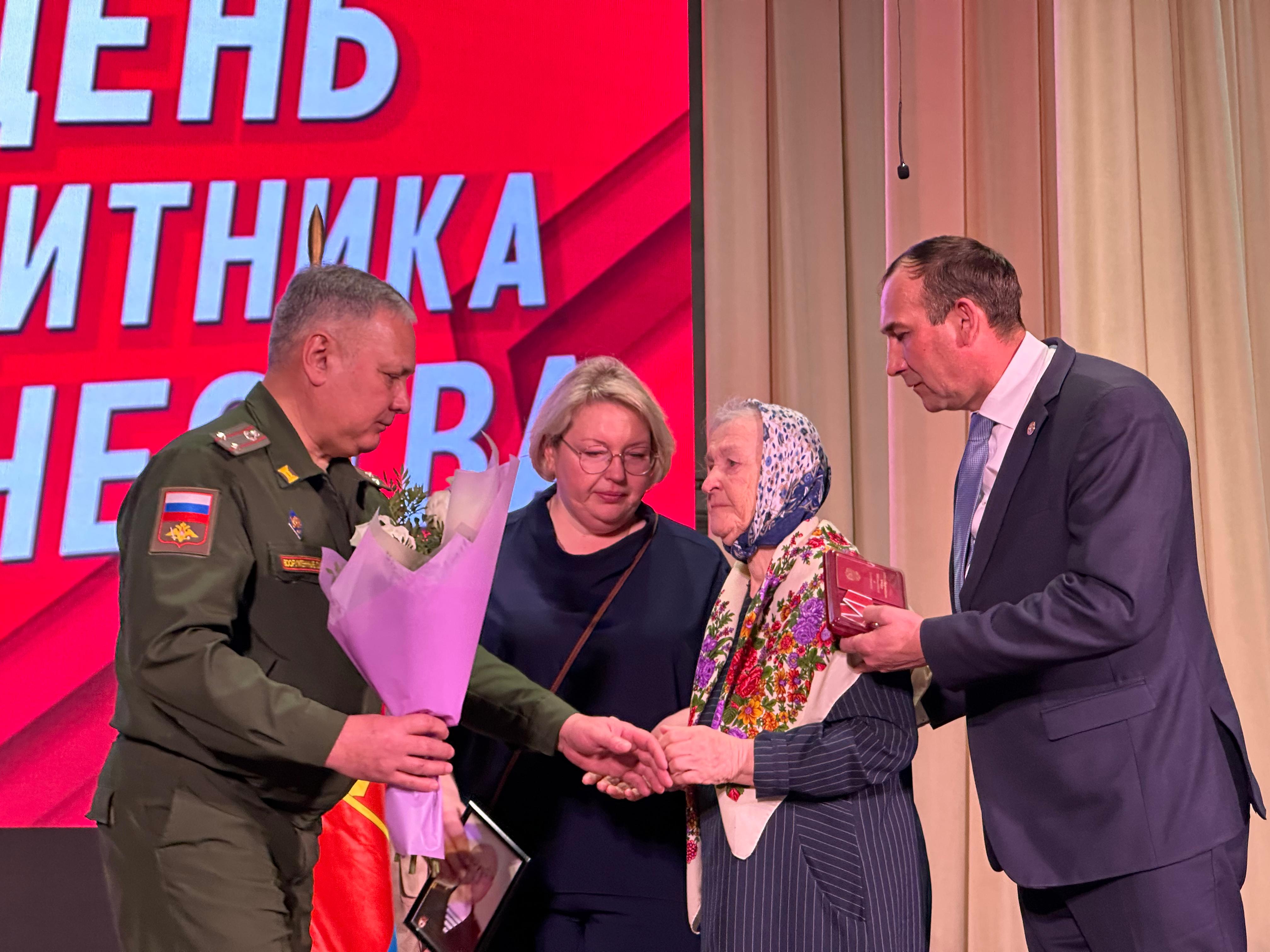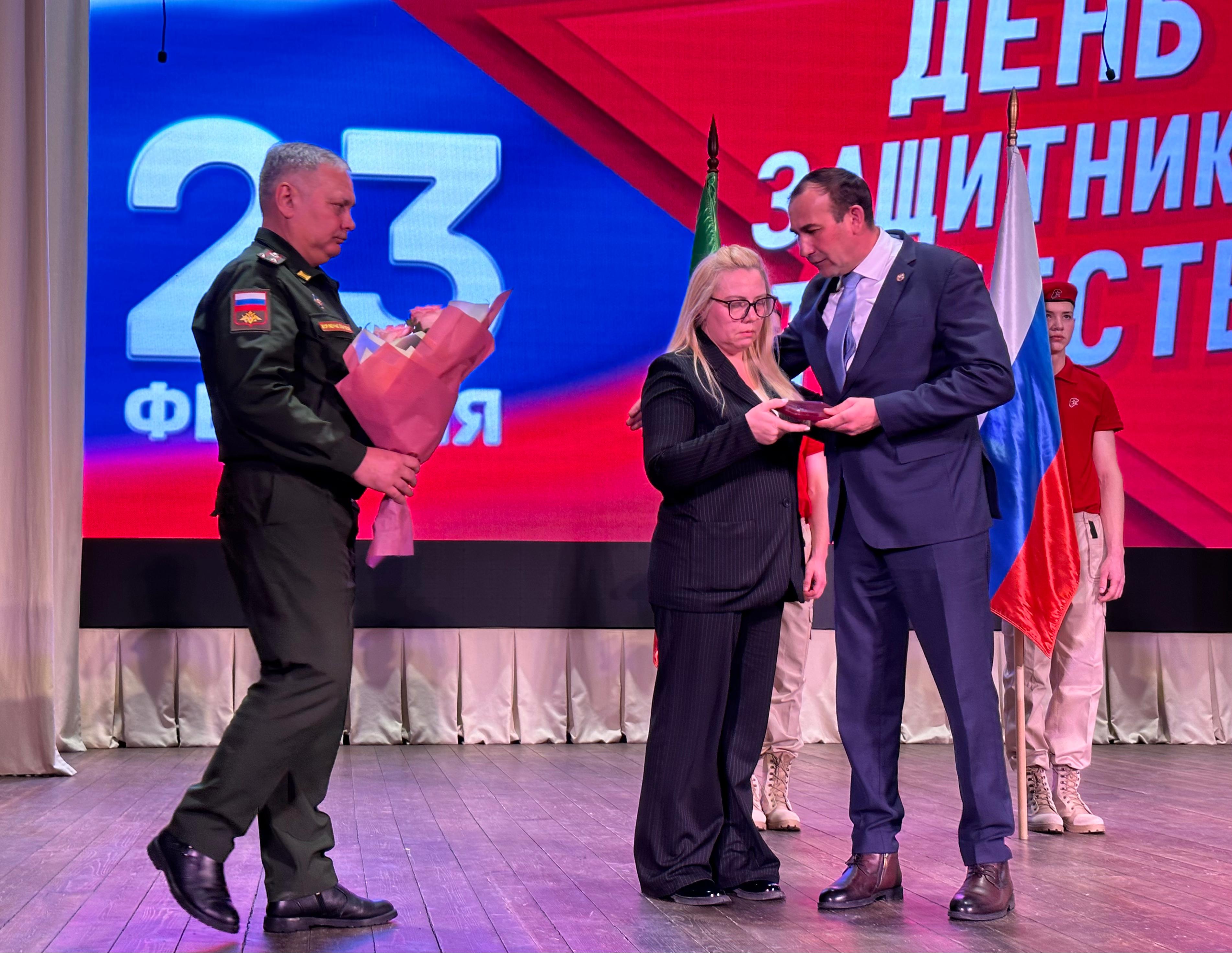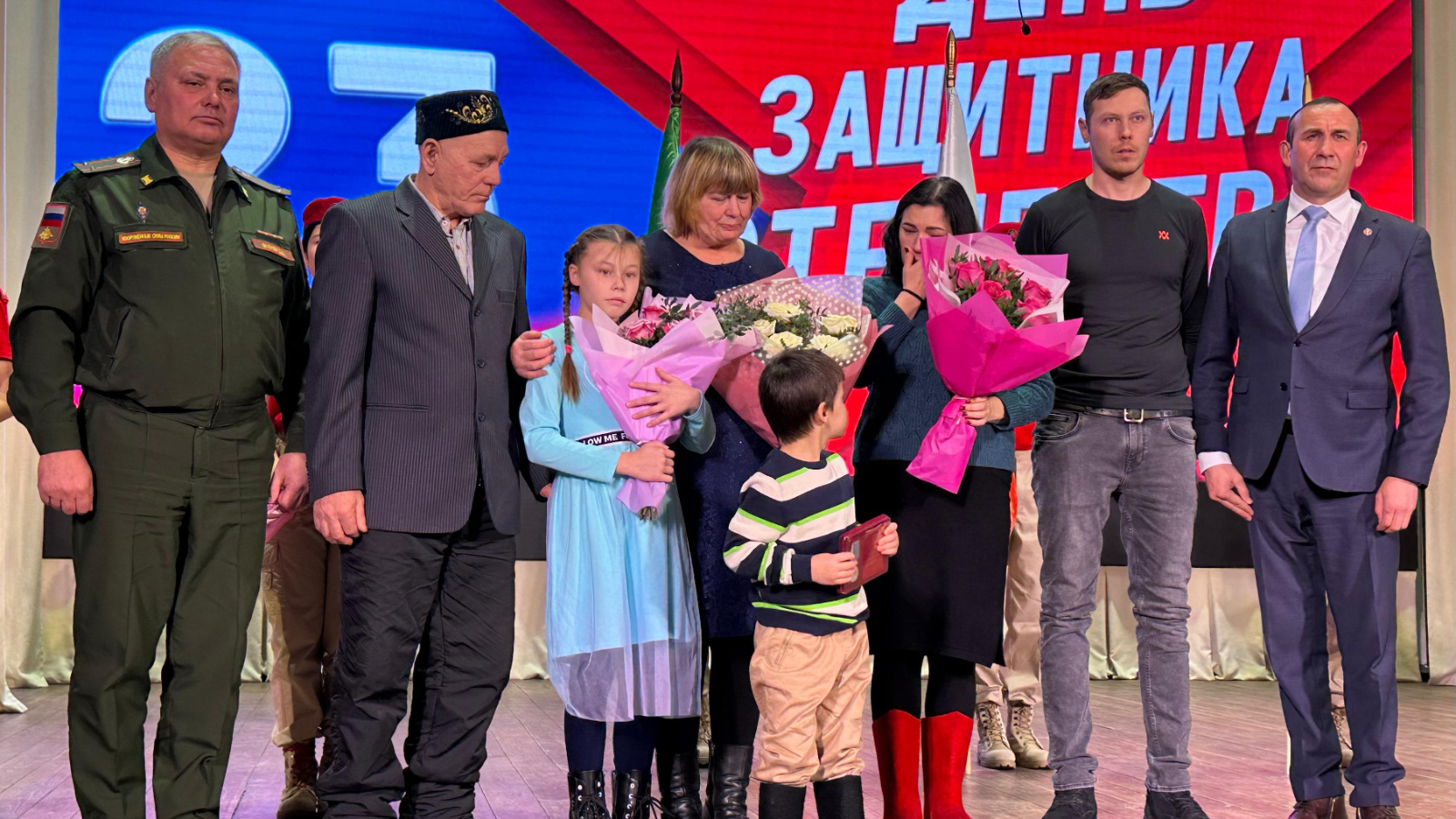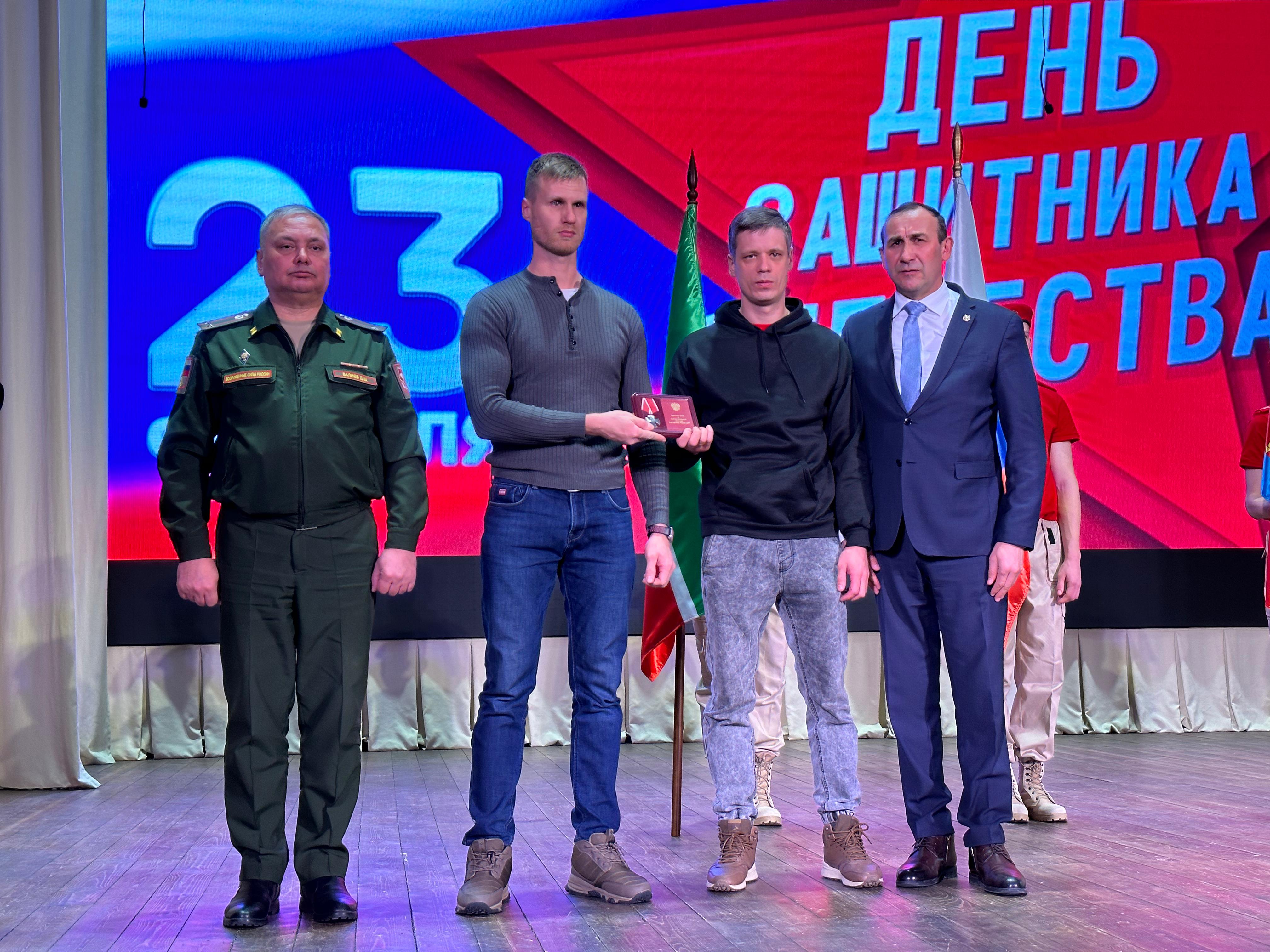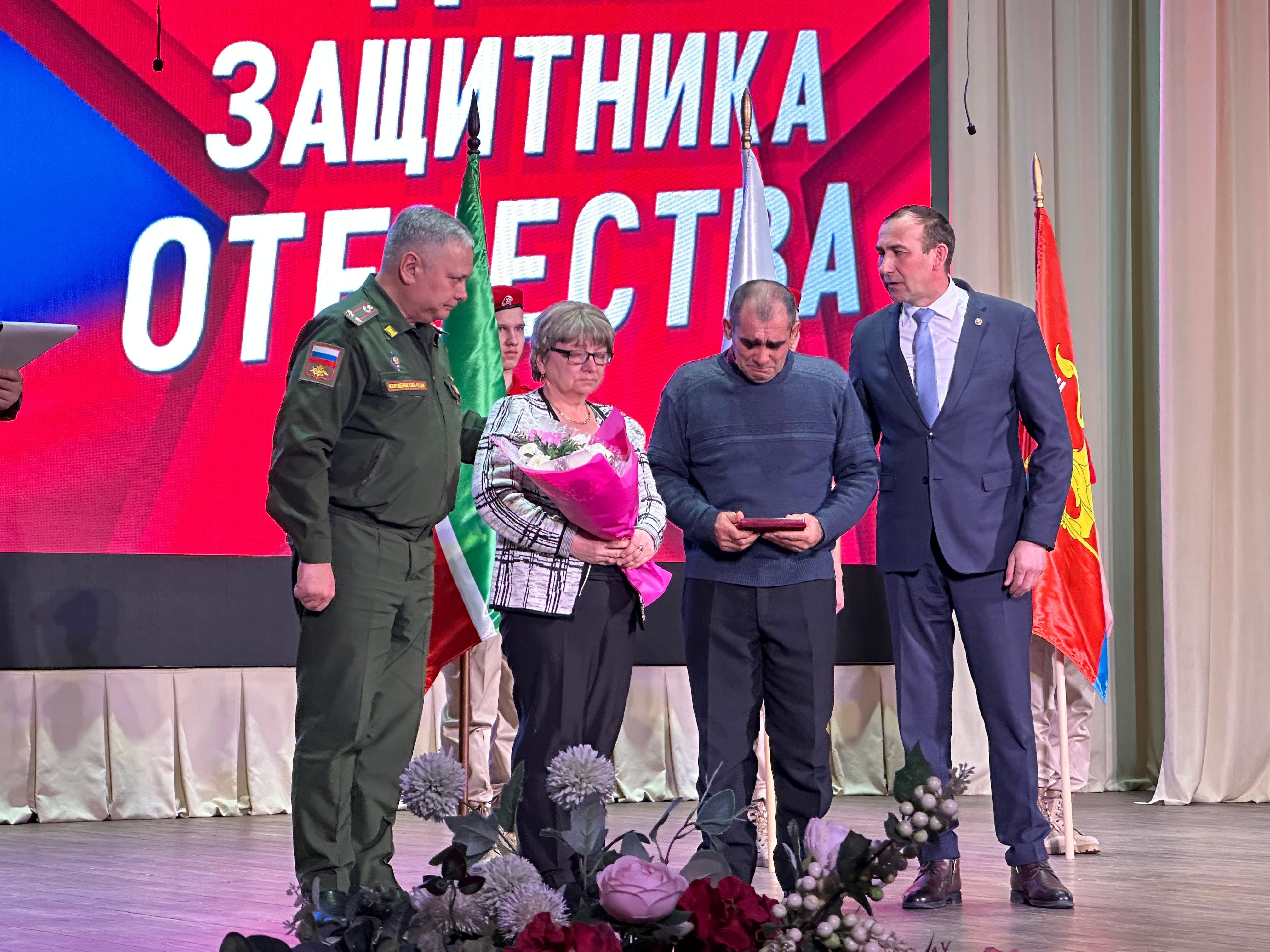 На торжественном открытии Года защитника Отечества РФ, Руководитель Исполнительного комитета Тукаевского района Камиль Назмиев и военный комиссар района Дамир Валиев вручили родственникам погибших на зоне спецоперации ордена Мужества: