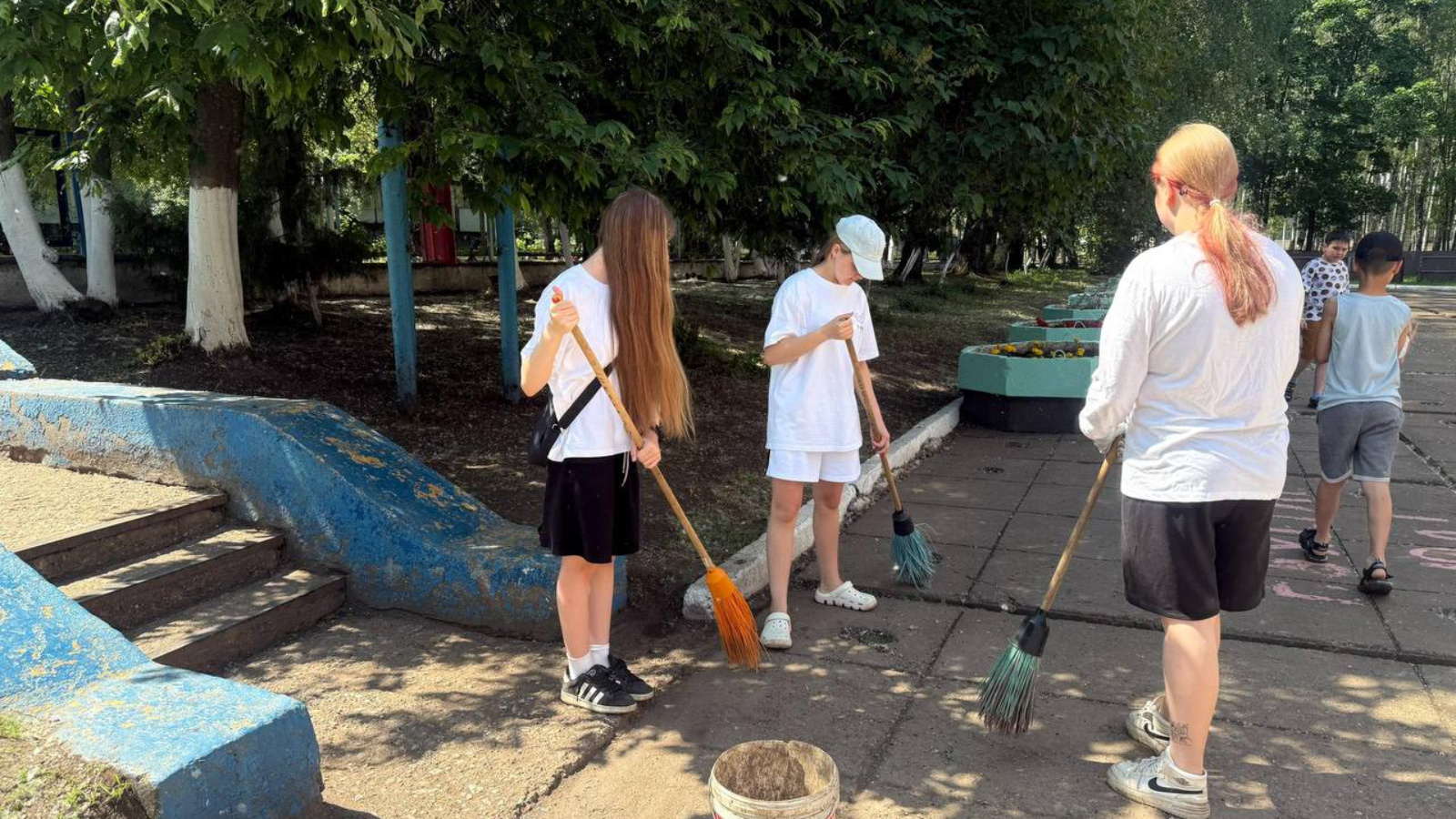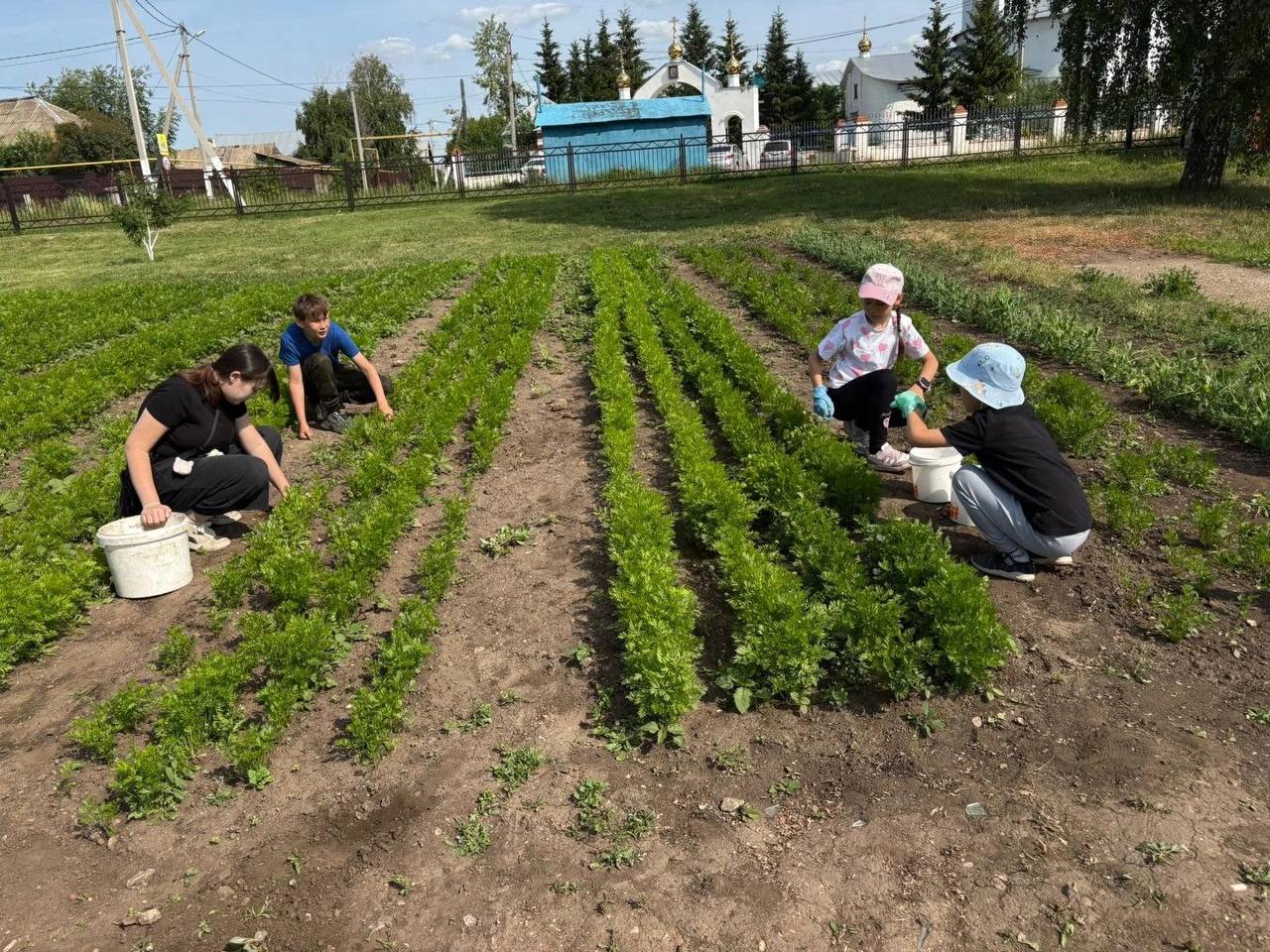 Дети работают на пришкольных участках. Силами детей выращиваются овощи, цветы. Они занимаются прополкой, поливкой грядок