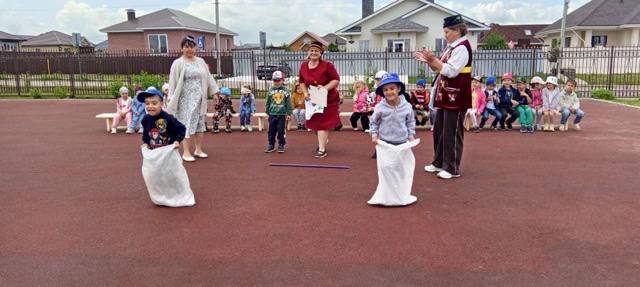 Ребята с удовольствием участвовали в играх: «Эй, дружок, продай горшок», «Бег в мешках», «Перенеси яйцо в ложке», «Принеси воду» и даже устроили настоящие «Конные скачки»!
