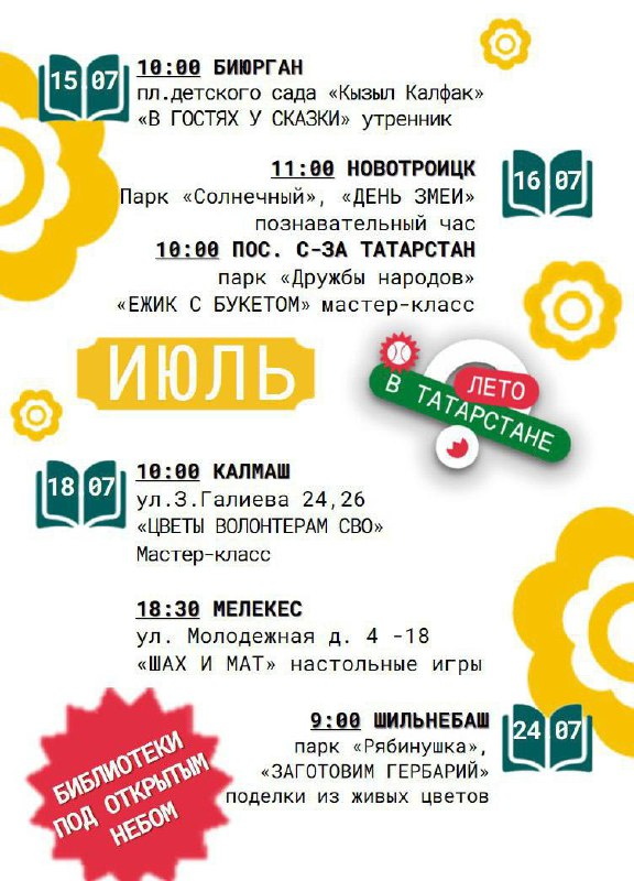 В рамках проекта «Лето в Татарстане» библиотеки Тукаевского района в июле приглашают жителей и гостей на яркие летние мероприятия: утренники, познавательные часы, мастер-классы, настольные игры и творческие встречи.