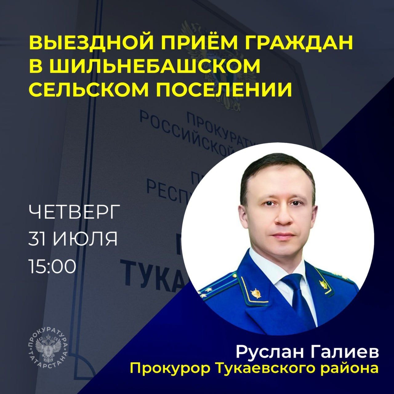 31 июля в 15:00 в здании администрации Шильнебашского сельского поселения состоится выездной приём граждан с участием прокурора Тукаевского района Руслана Галиева.