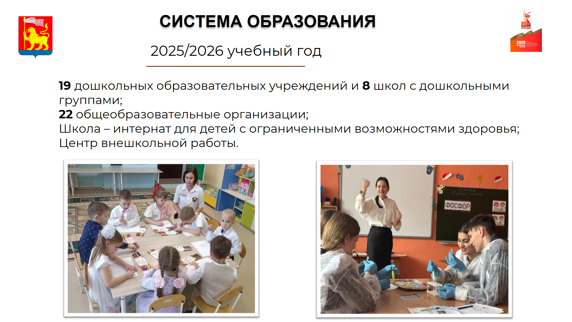 19 муниципальных детских садов и 8 школ с дошкольными группами;