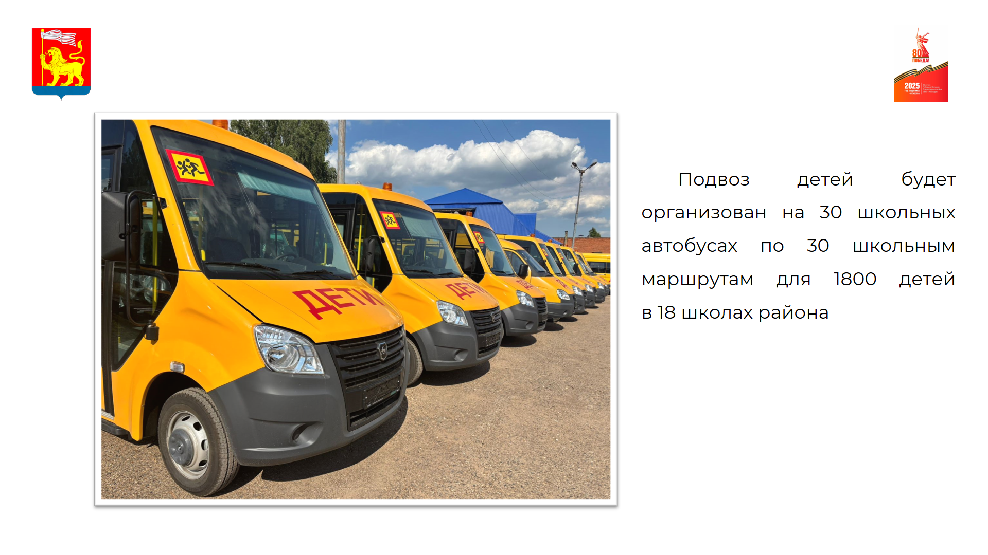 Подвоз детей будет организован на 30 школьных автобусах по 30 школьным маршрутам для 1800 детей в 18 школах района.