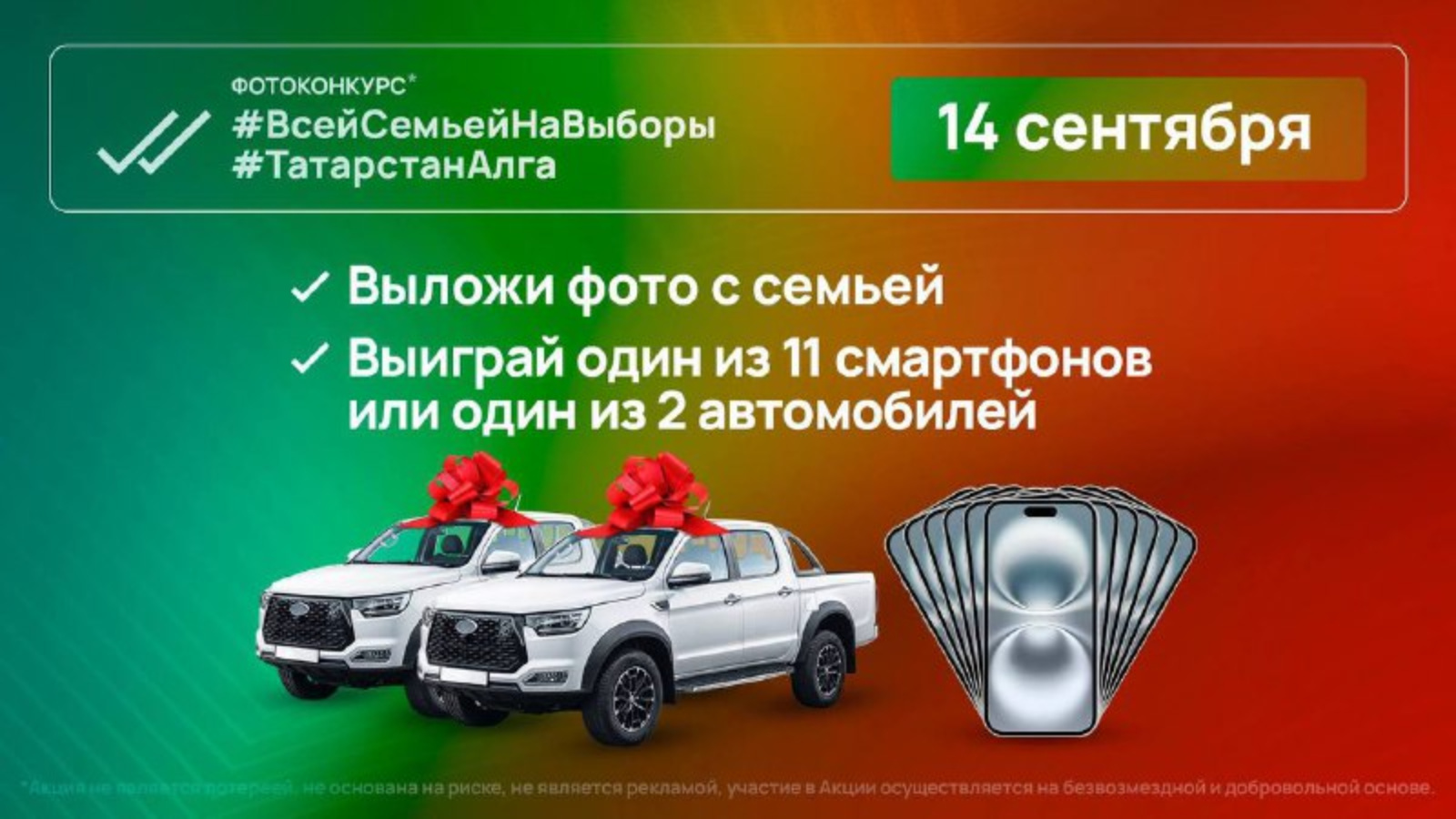 14 сентября, в день проведения выборов Раиса Татарстана и муниципальных депутатов пройдет фотоконкурс #ТатарстанАлга #ВсейСемьейНаВыборы. По его итогам можно выиграть автомобиль или смартфон