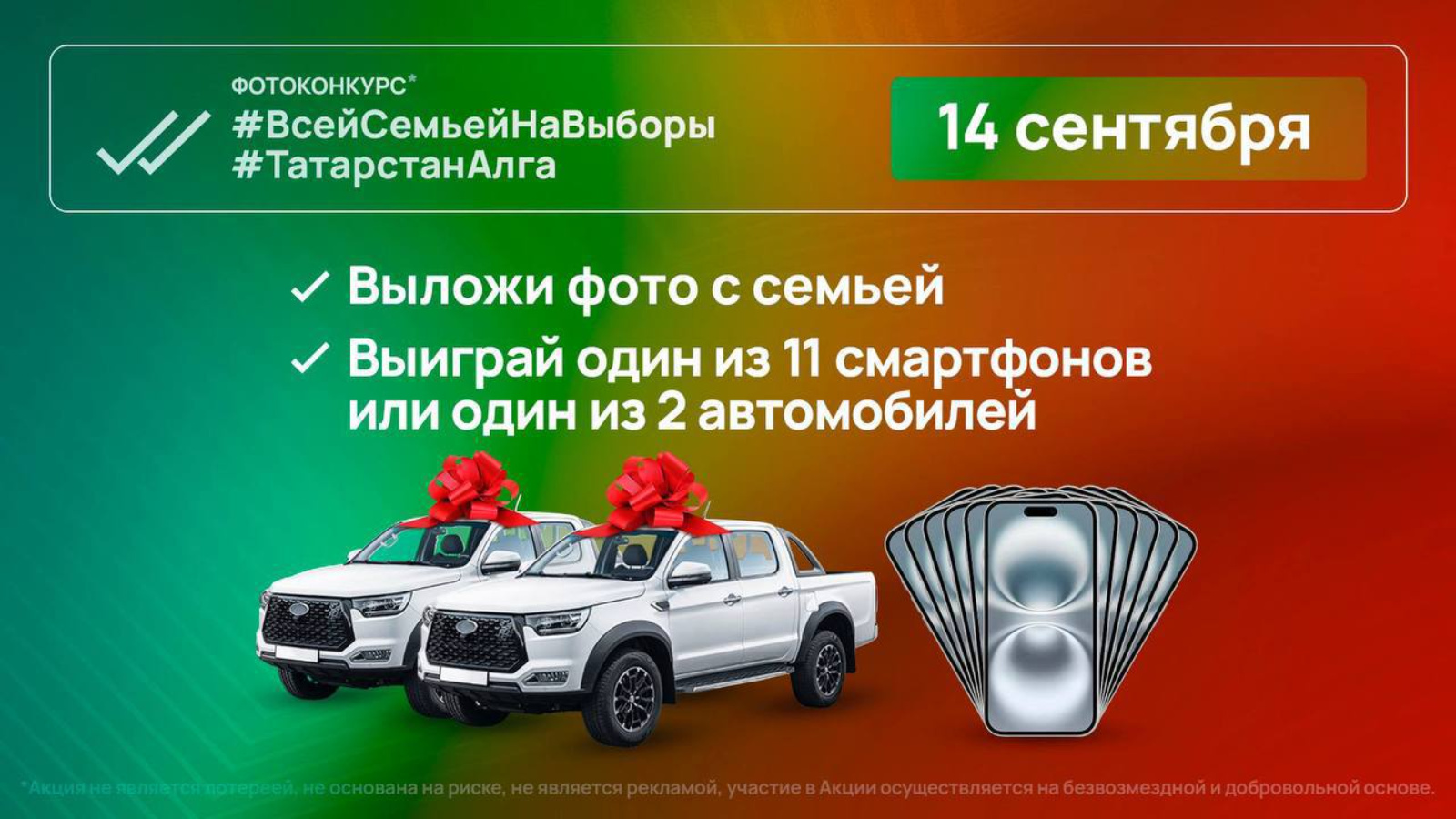 14 сентября, в день проведения выборов Раиса Татарстана и муниципальных депутатов пройдет фотоконкурс #ТатарстанАлга #ВсейСемьейНаВыборы. По его итогам можно выиграть автомобиль или смартфон.
