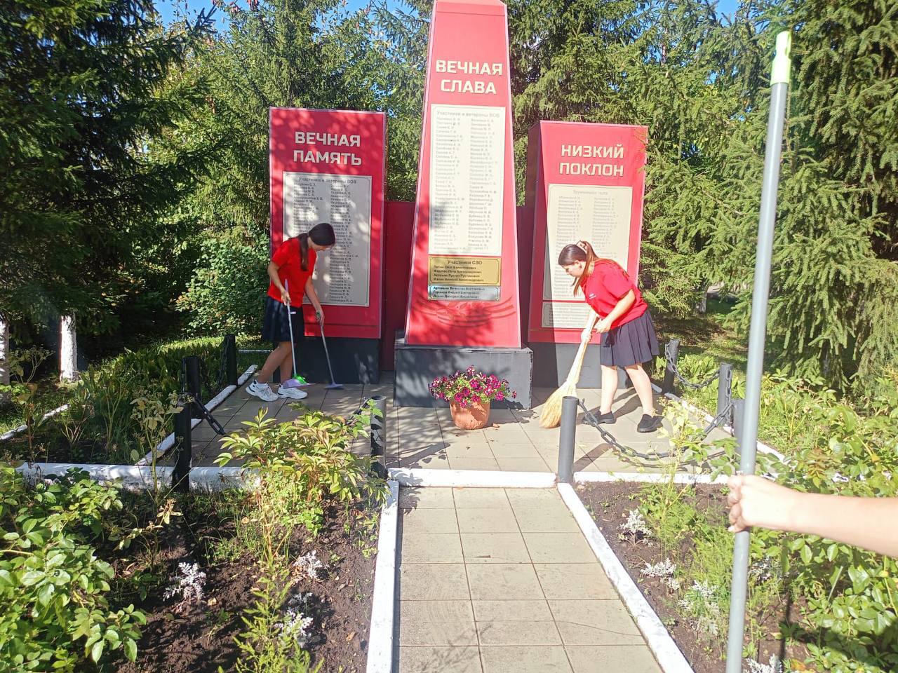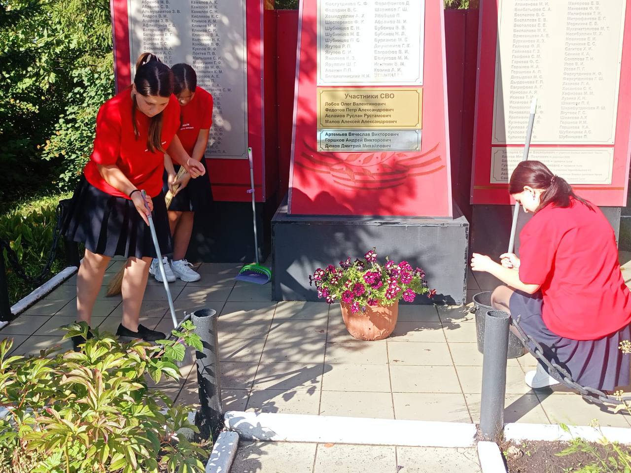 Ученики Комсомольской школы и школы посёлка Круглое Поле организовали уборку у памятников, демонстрируя уважение к памяти защитников Отечества и бережное отношение к историческим местам.