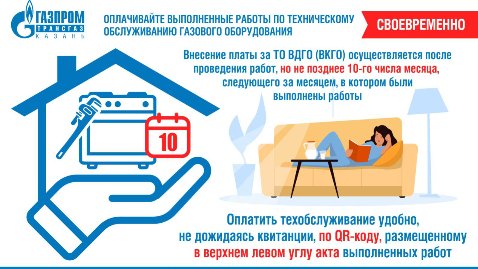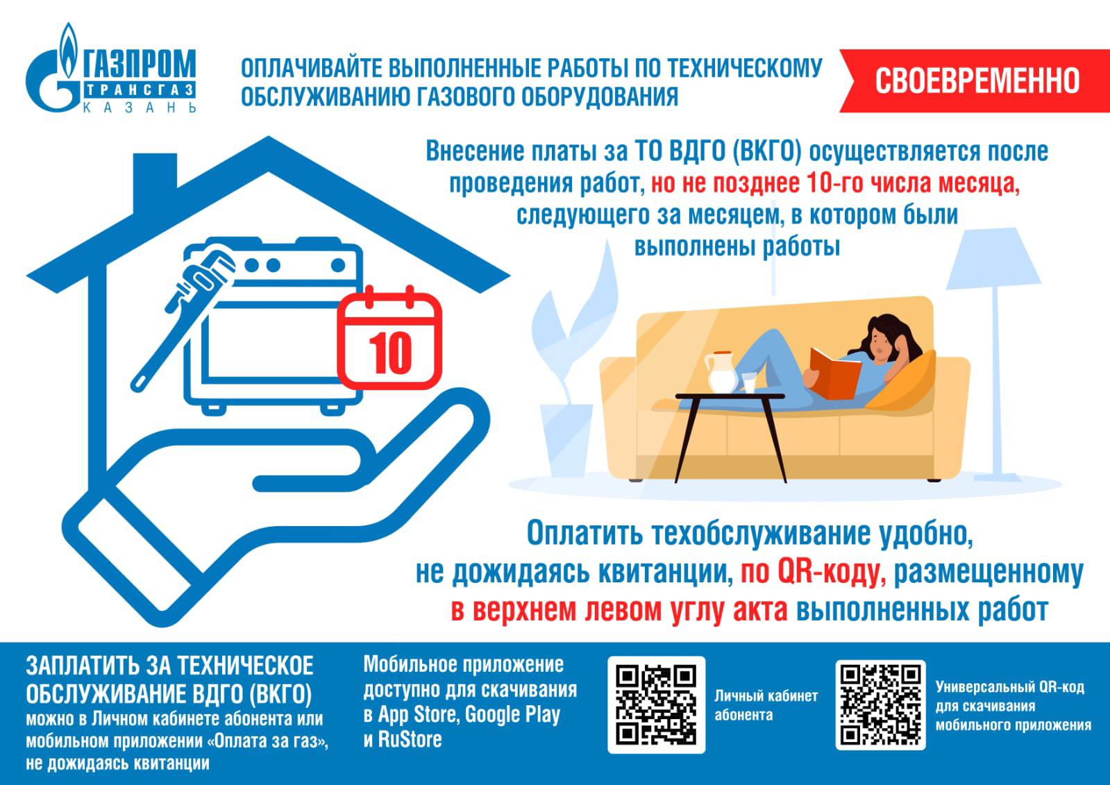 Техническое обслуживание внутридомового и внутриквартирного газового оборудования (ТО ВДГО/ВКГО) проводится строго по правилам. После выполнения работ необходимо оплатить услугу не позднее 10-го числа следующего месяца.