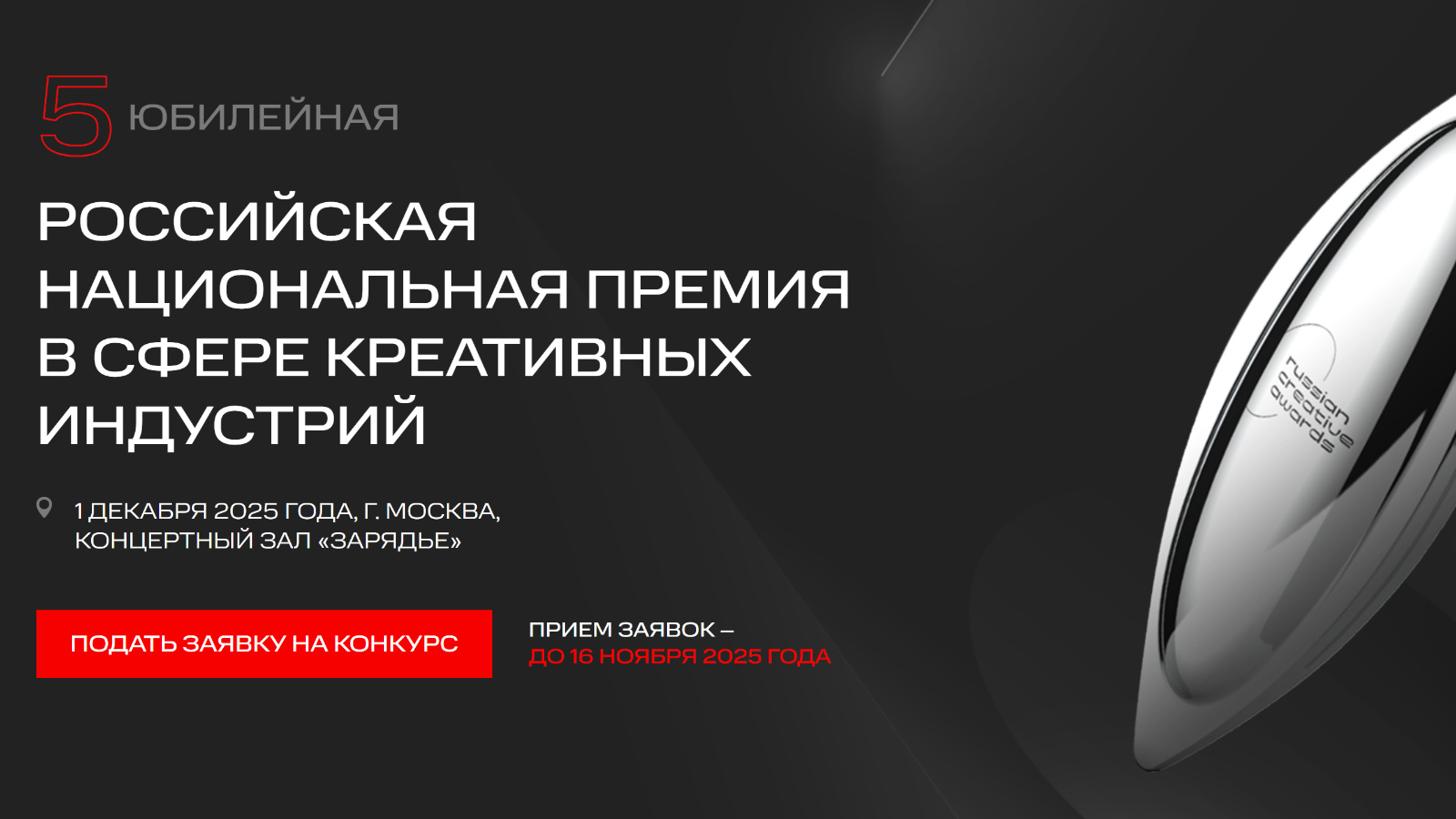 Информируем, что до 16 ноября 2025 года (включительно) продолжается прием заявок на V юбилейный сезон Российской национальной премии в сфере креативных индустрий (далее – Премия), проводимой при поддержке Администрации Президента Российской Федерации. Премия является главной наградой страны в области креативных индустрий, единственной в мире кросс-отраслевой премией, охватывающей 16 направлений креативного сектора.