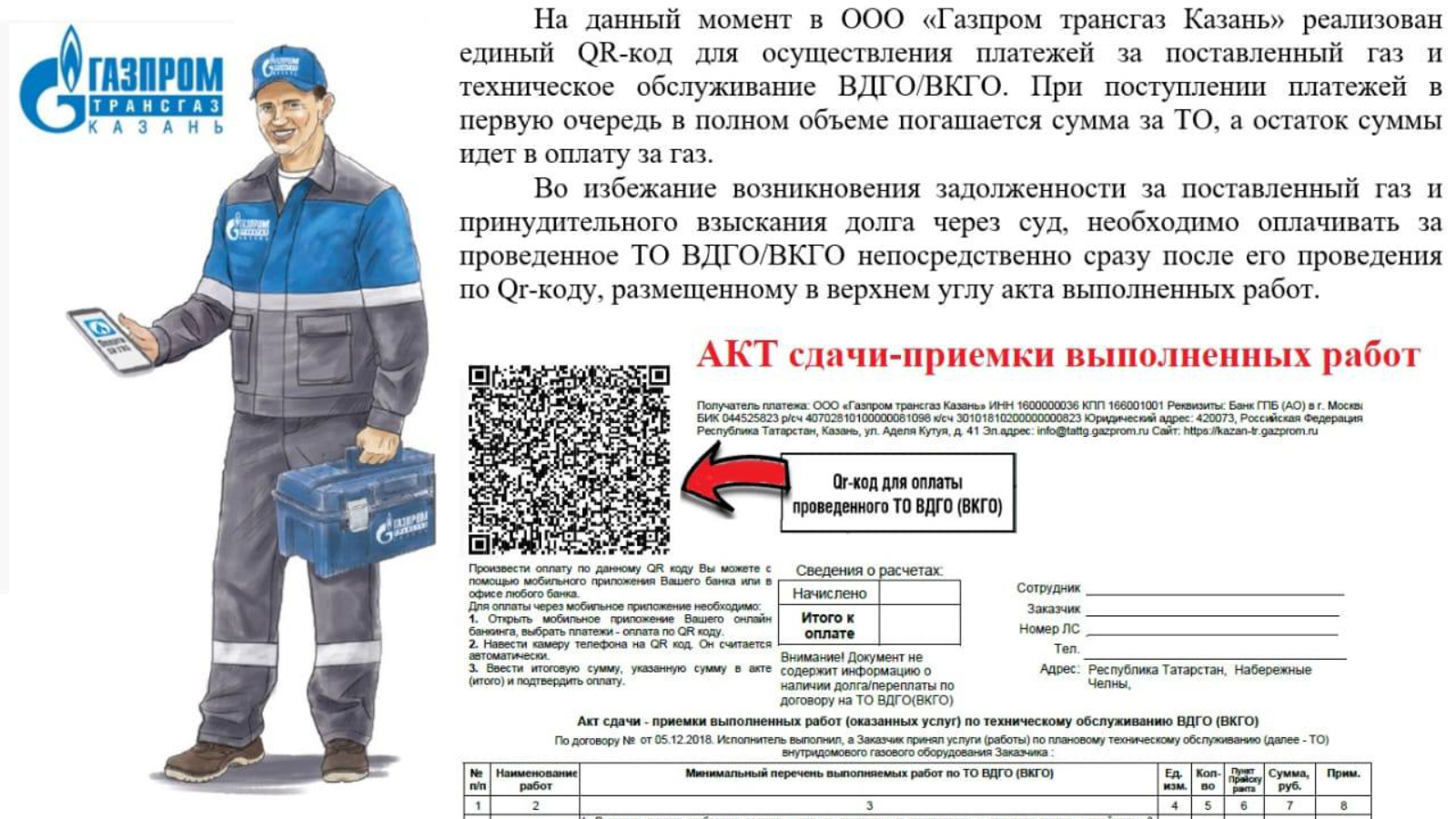 В ООО «Газпром трансгаз Казань» действует единый QR-код для оплаты поставленного газа и технического обслуживания ВДГО/ВКГО.