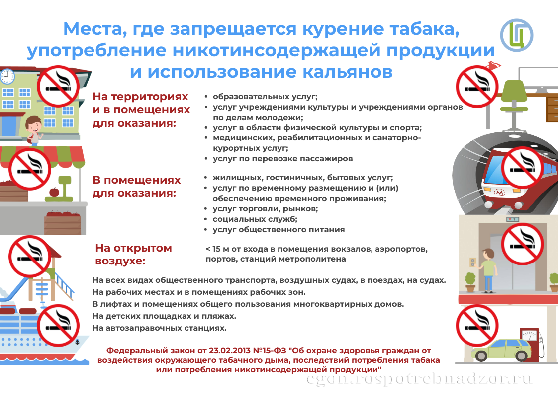Федеральным законом от 23.02.2013 № 15-ФЗ «Об охране здоровья граждан от воздействия табачного дыма и последствий потребления табака», ст.12, установлены места, где запрещено курить, а также требования к знаку о запрете курения.