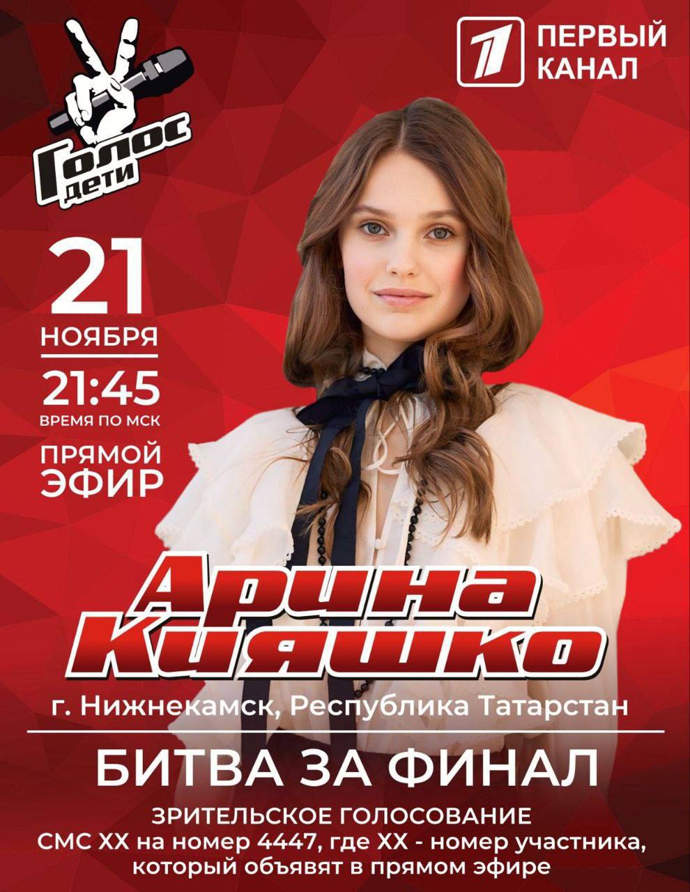 В ходе эфира будет открыто голосование, и лишь один участник получит право выйти в финал. Поддержим всей республикой нашу талантливую землячку, Кияшко Арину из Нижнекамска!