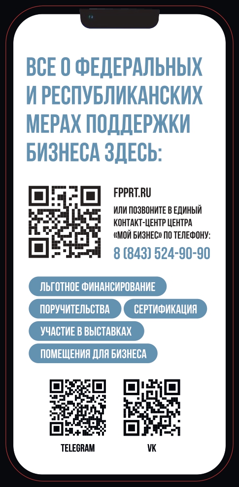 Вся информация о доступных мерах поддержки собрана на специализированном портале FPPRT.RU. Также получить консультацию можно по телефону Единого контакт-центра Центра «Мой бизнес»: 8 (843) 524-90-90.