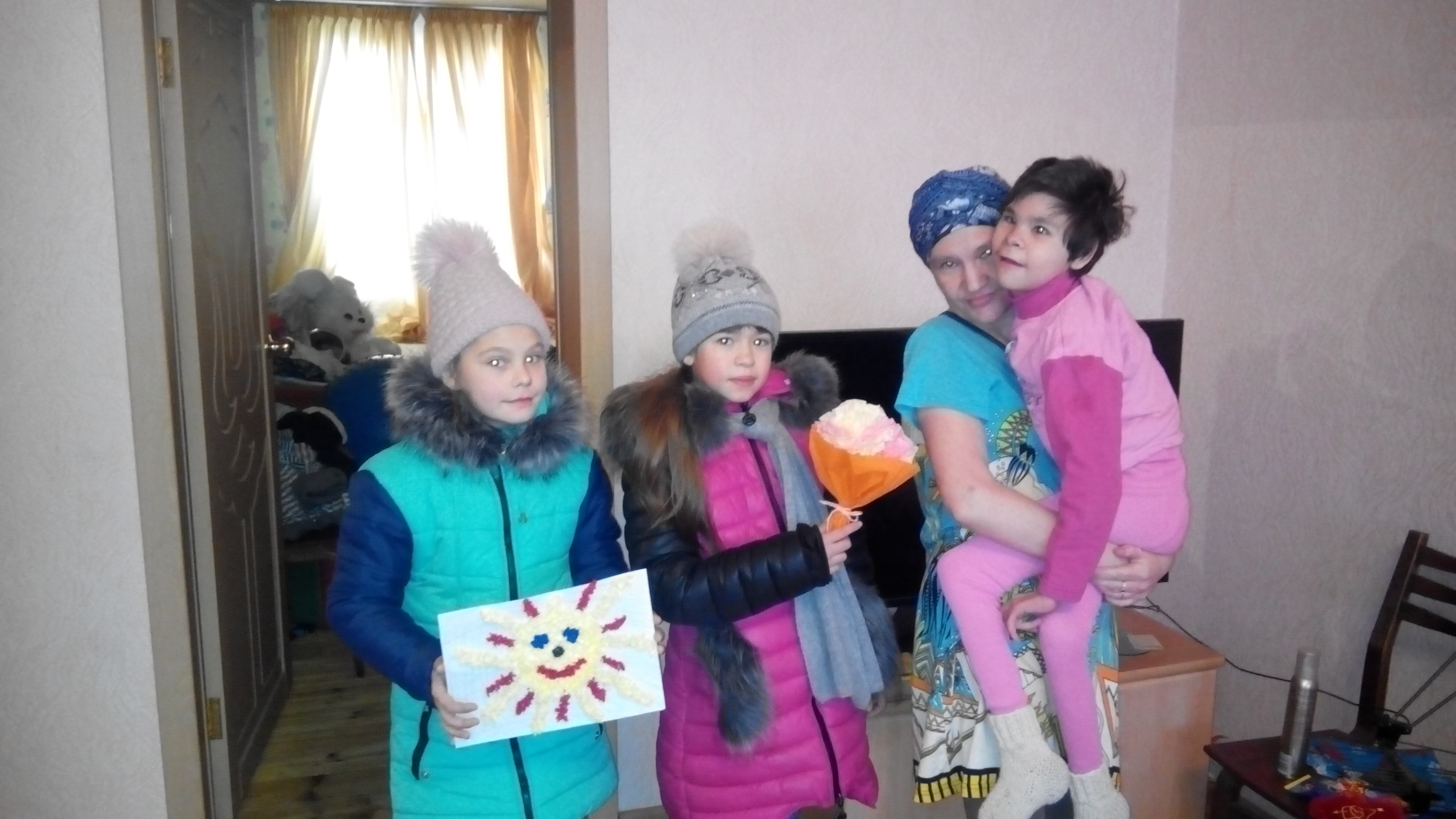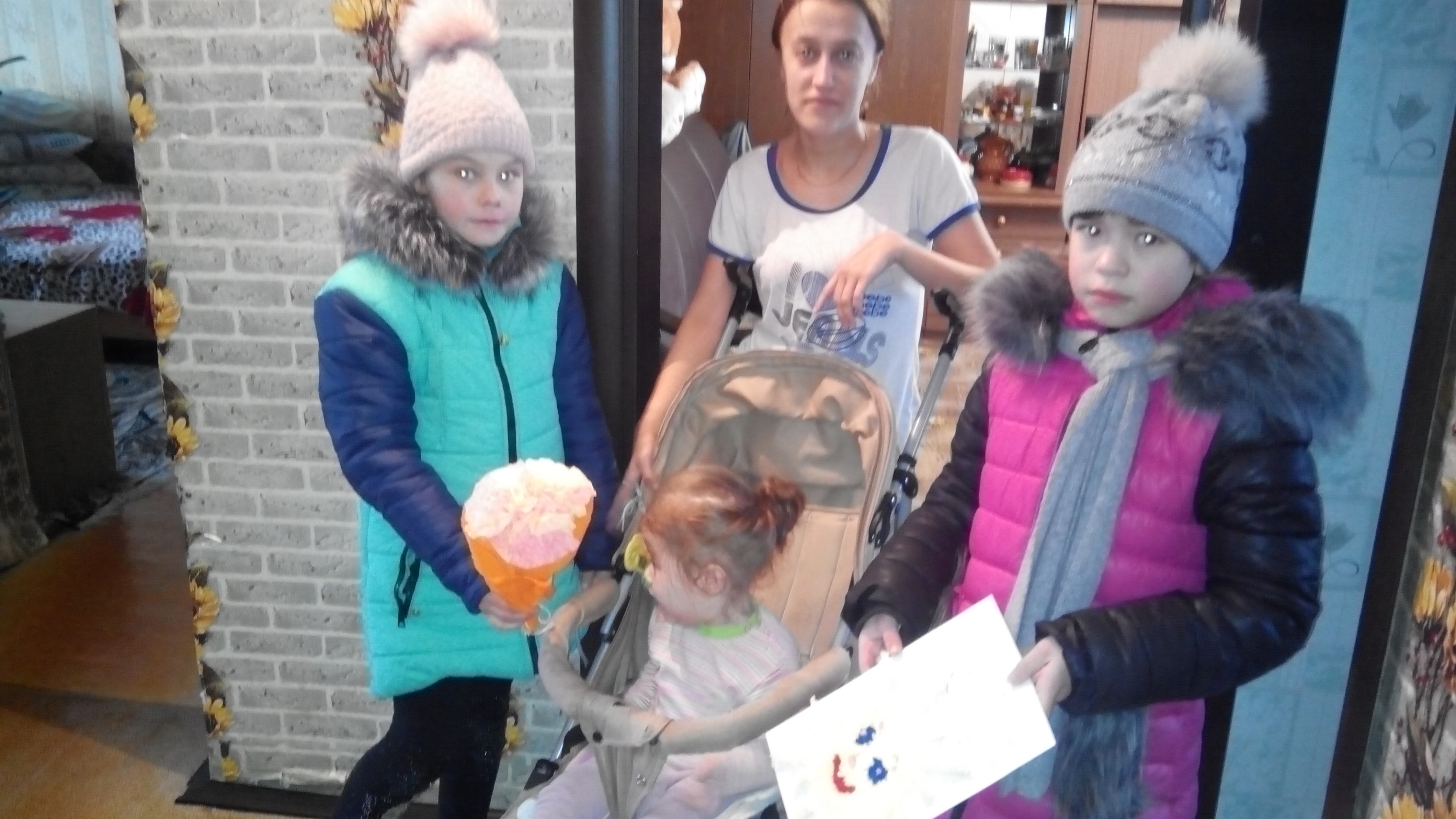 Волонтеры подарили букеты цветов из салфеток и картины, сделанные своими руками. Картины были изготовлены, используя технологию «торцевание». Дети и родители получили массу положительных эмоций и выразили желание устраивать такие встречи с волонтерами чаще.