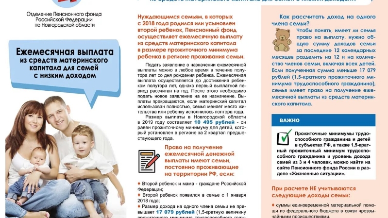 Пенсия фонды идарәсе ана капиталы акчаларыннан айлык түләү билгеләү өчен гаризалар кабул итүне дәвам итә. Мондый мөмкинлек агымдагы ел башында, РФ Хөкүмәте тарафыннан Россия гаиләләренә балалар белән ярдәм итү буенча кабул ителгән яңа демографик чаралардан соң барлыкка килде. Исегезгә төшерәбез, яңа юнәлеш 2018 елның 1 гыйнварыннан соң туган яисә уллыкка алынган ,түбән керемле (гаиләдә бер кешегә 1,5 яшәү минимумыннан кимрәк) гаиләләргә кагыла . Ул балага 1,5 яшь тулганчы башкарыла, әмма беренче түләү чоры бер елга исәпләнгән. Шуннан соң аны билгеләү өчен яңадан гариза бирергә кирәк. Гаиләнең гомуми керемен исәпләгәндә хезмәт хакы, премияләр, пенсияләр, социаль пособиеләр, стипендияләр, төрле компенсацияләр, алиментлар һ.б. исәпкә алына. Гадәттән тыш хәлләргә бәйле рәвештә, федераль бюджеттан бер тапкыр бирелә торган матди ярдәм күләме, банк депозитларыннан керемнәр һәм милекне арендага бирү исәпкә алынмый. Әгәр дә балалар гаиләнең керемнәре турында дөрес булмаган мәгълүматлар бирелсэ, шулай ук ата-ана хокукыннан мәхрүм ителгән гражданнарга айлык түләү билгеләнми.