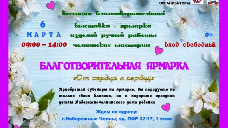 2019 елның 6 мартында Пенсия фонды идарәсендә (яңа шәһәр, 32/17) 9.00 сәгатьтән 14.00 сәгатькә кадәр "Йөрәктән йөрәккә" традицион хәйрия ярминкәсе узачак.