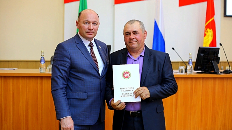 Тукай муниципаль районы башлыгы Фаил Камаев аппарат киңәшмәсендә АХП ҖЧҖ “Сәйдәшев исемендә” ге машина йөртучесе Мөнавиров Ринат Равил улына озак еллар намуслы хезмәте һәм авыл хуҗалыгын үстерүгә керткән шәхси өлеше өчен һәм юбилей туган көне уңаеннан Татарстан Республикасы Авыл хуҗалыгы һәм азык-төлек министрлыгының Мактау грамотасын тапшырды.