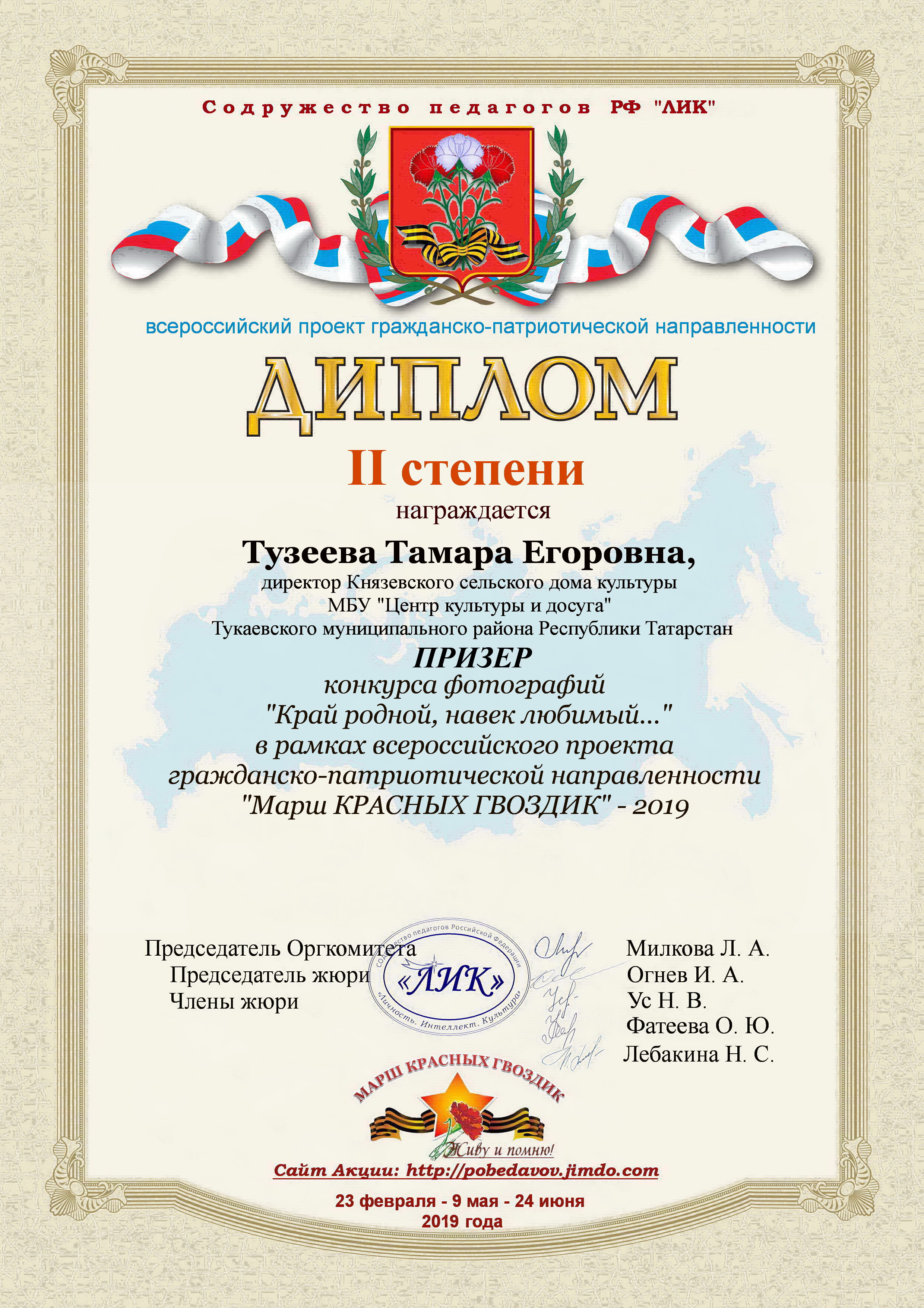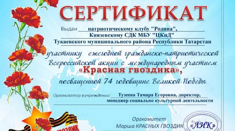 Гражданлык-патриотик юнәлештәге"Кызыл канәфер маршы- 2019. " проекты кысаларында ,«Кызыл канәфер – 2019» Бөтенроссия акциясендә актив катнашканы өчен «Родина» патриотик клубы һәм Тукай муниципаль районының «ЦКиД» Кенәз мәдәният йортының «Волонтер» клуб берләшмәсе «Туган ягым, яраткан өем! " фотографияләр конкурсында сертификат һәм IIнче дәрәҗә Диплом белән бүләкләнделәр.