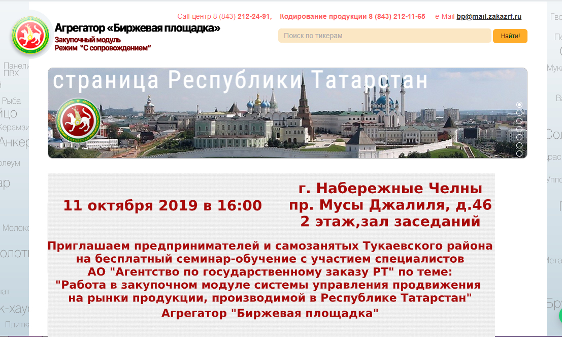2019 елның 11 октябрендә 16.00 сәгатьтә Тукай районы эшкуарларын һәм үзмәшгульләрен"Дәүләт заказурты агентлыгы" АҖ белгечләре катнашында"Татарстан Республикасында җитештерелә торган продукцияне базарларга чыгару белән идарә итү системасының сатып алу модулендә эшләү" темасына бушлай семинар - укуларга чакырабыз" Биржа мәйданчыгы " агрегаторы"