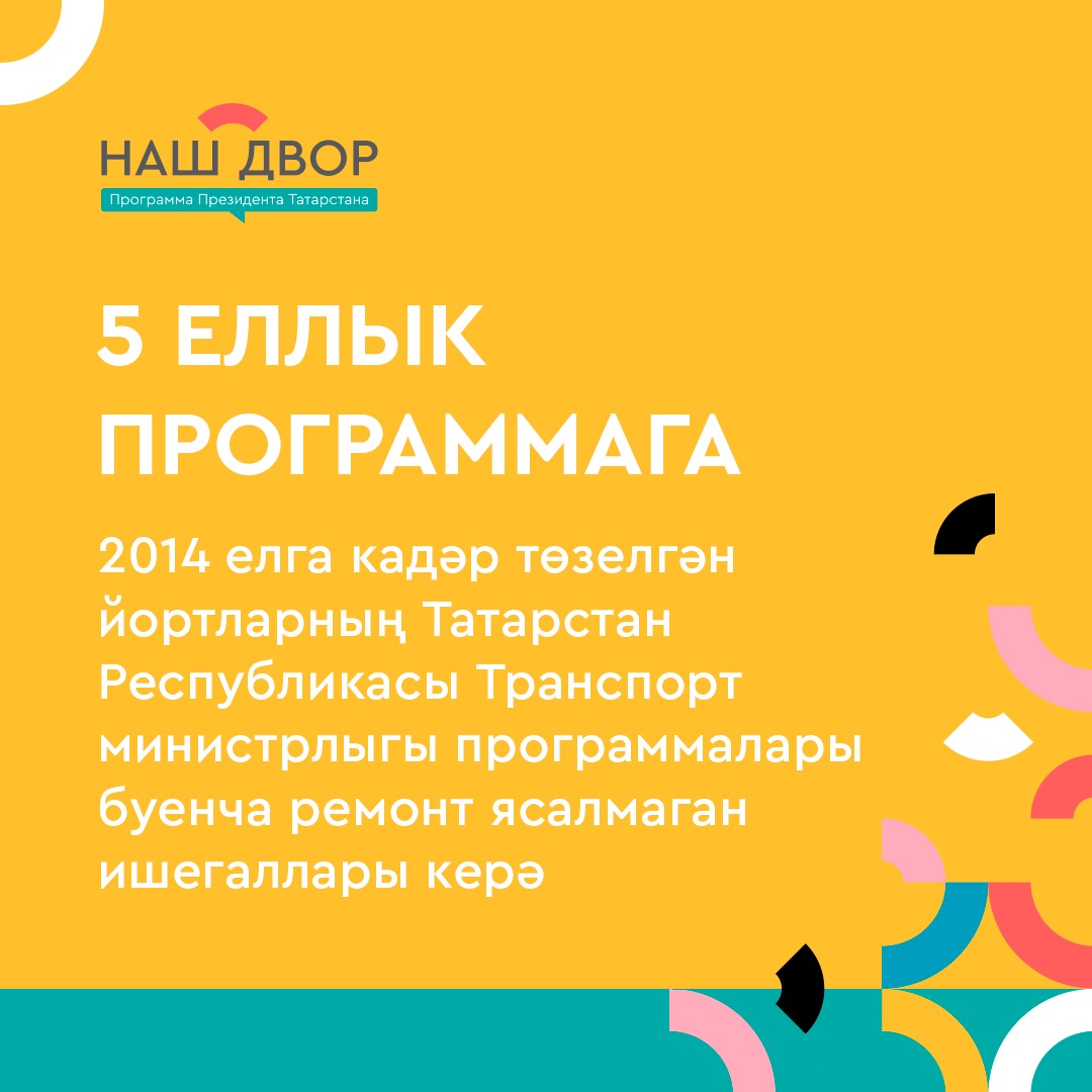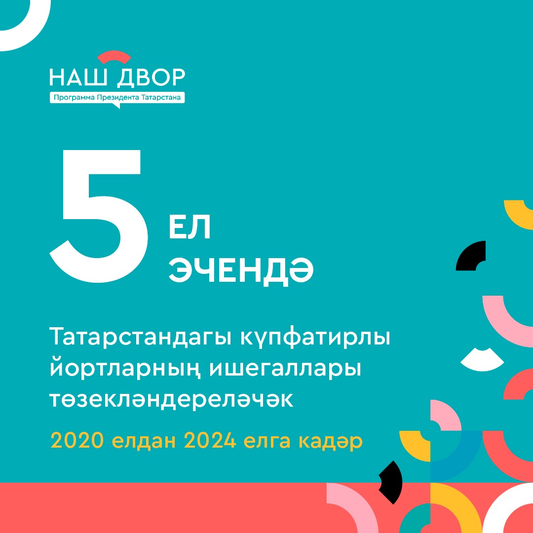 2020 елдан 2024 елга кадәр Татарстанда 7000 гә якын ишегалды төзекләндереләчәк. Әлеге киң колачлы программа 2019 елда Татарстан Президенты Рөстәм Миңнеханов инициативасы белән башланып китте. Төзекләндереләсе ишегаллары исемлегенә 2014 елга кадәр төзелгән йортларның ТР Транспорт министрлыгының ишегалды территорияләрен төзекләндерү программасы буенча ремонт ясалмаган ишегаллары керә.