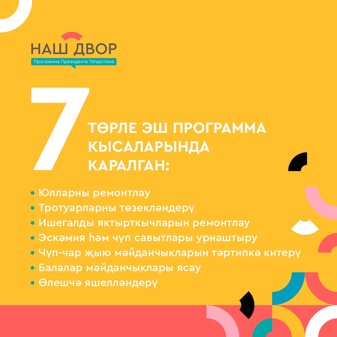 Юлларны һәм тротуарларны ремонтлаудан тыш, «Безнең ишегалды» программасына ишегалдындагы яктырткычларны алыштыру, эскәмияләр һәм чүп савытлары урнаштыру, өслегенә комлы-вак ташлы катнашма җәелгән балалар мәйданчыклары ясау, шулай ук чүп-чар һәм каты көнкүреш калдыкларын җыю урыннарын тәртипкә китерү һәм өлешчә яшелләндерү эшләрен башкару да керә.