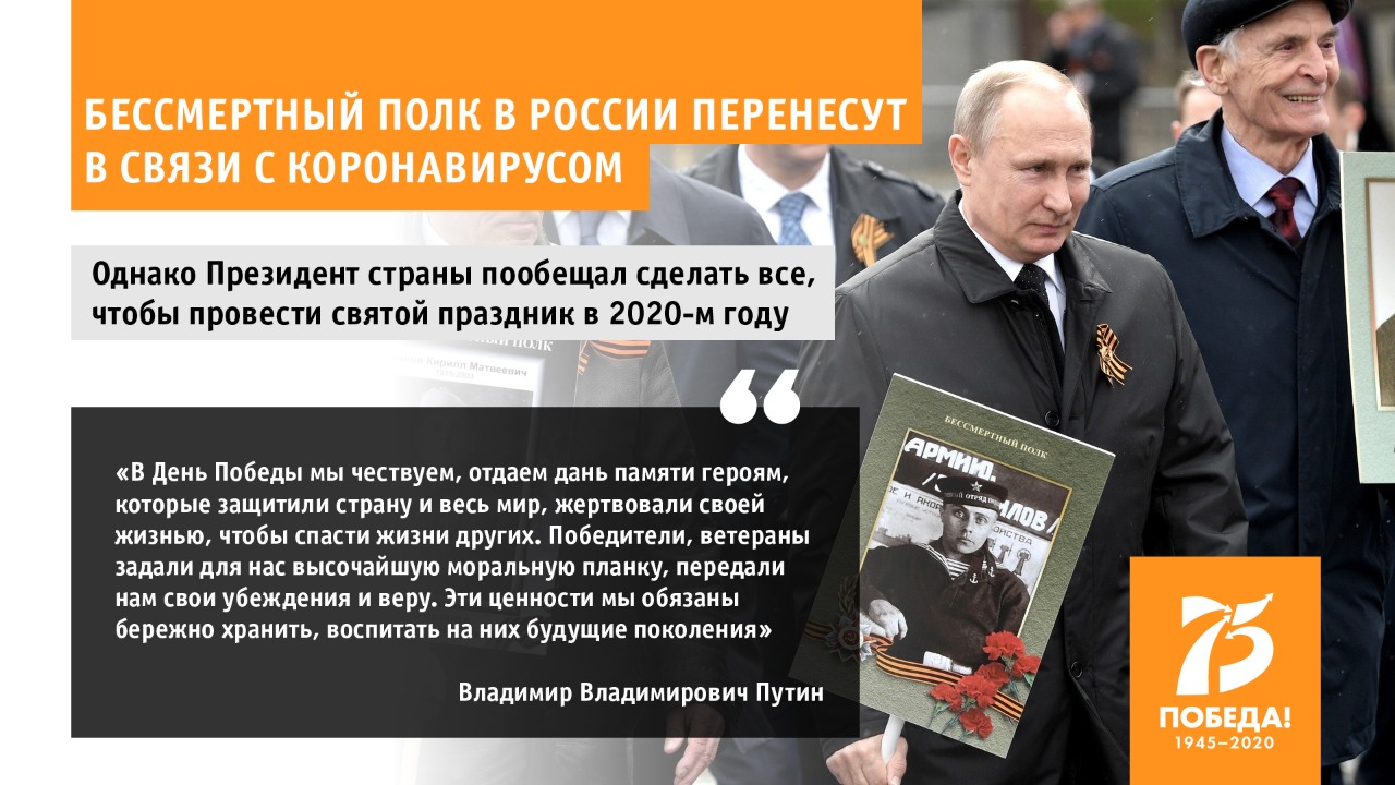 Россия Президенты карары буенча Җиңүнең 75 еллыгы уңаеннан барлык бәйрәм чаралары, шул исәптән Җиңү парады һәм Үлемсез полк йөреше күчерелде. Аларны үткәрү датасы әлегә билгеле түгел. Әмма тантаналар, һичшиксез, гражданнар тормышы өчен куркыныч югалгач булачак, дип вәгъдә итте Владимир Путин.